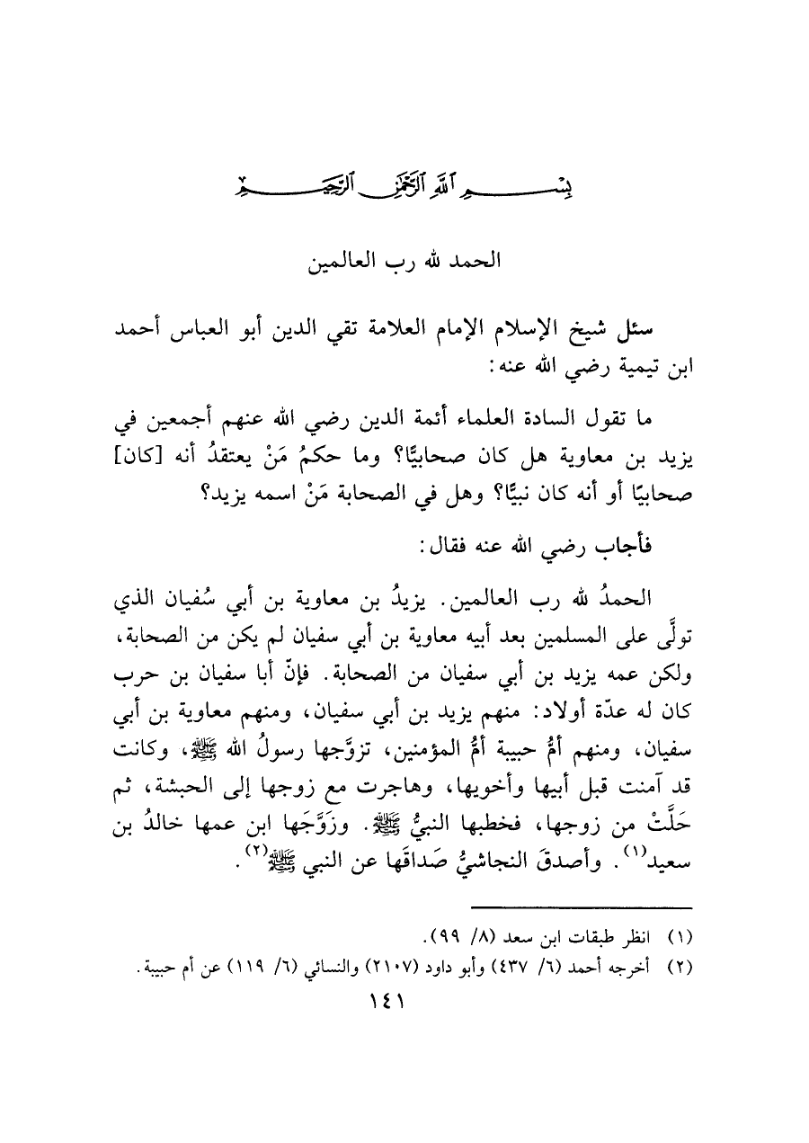 الحمدُ لله رب العالمين. يزيدُ بن معاوية بن أبي سُفيان الذي تولَّى على المسلمين بعد أبيه معاوية بن أبي سفيان لم يكن من الصحابة، ولكن عمه يزيد بن أبي سفيان من الصحابة. فإن أبا سفيان بن حرب كان له عدّة أولاد: منهم يزيد بن أبي سفيان، ومنهم معاوية بن أبي سفيان، ومنهم أمُّ حبيبة أمُّ المؤمنين، تزوَّجها رسولُ الله - صَلَّى اللَّهُ عَلَيْهِ وَسَلَّمَ -، وكانت قد آمنت قبل أبيها وأخويها، وهاجرت مع زوجها إلى الحبشة، ثم حَلَّتْ من زوجها، فخطبها النبي - صَلَّى اللَّهُ عَلَيْهِ وَسَلَّمَ -. وزوَّجَها ابن عمها خالدُ بن سعيد (¬١). وأصدقَ النجاشيُّ صَداقَها عن النبي - صَلَّى اللَّهُ عَلَيْهِ وَسَلَّمَ - (¬٢).