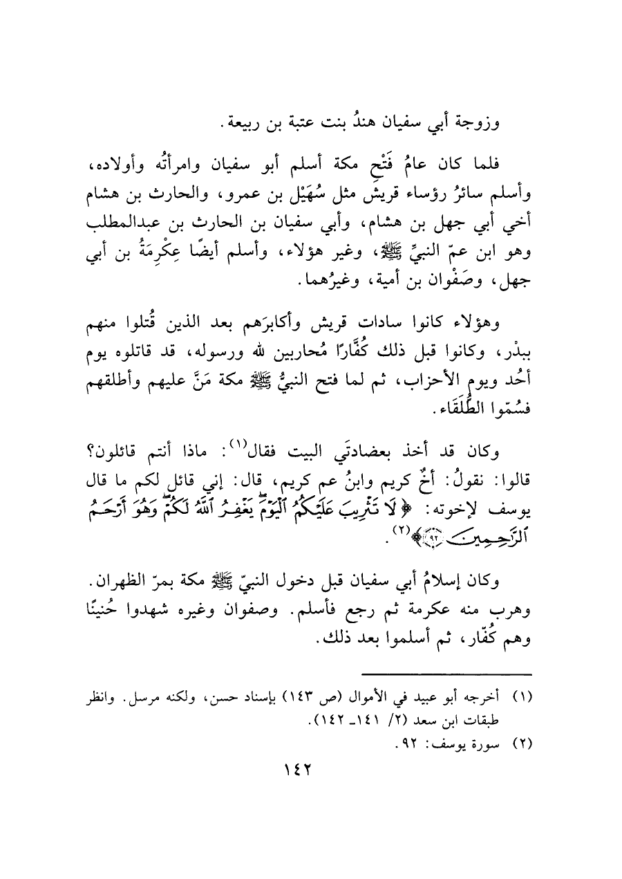 فلما كان عامُ فَتْحِ مكة أسلم أبو سفيان وامرأتُه وأولاده، وأسلم سائرُ رؤساء قريش مثل سُهَيْل بن عمرو، والحارث بن هشام أخي أبي جهل بن هشام، وأبي سفيان بن الحارث بن عبد المطلب وهو ابن عمّ النبيِّ - صَلَّى اللَّهُ عَلَيْهِ وَسَلَّمَ -، وغير هؤلاء، وأسلم أيضًا عِكْرِمَةُ بن أبي جهل، وصَفْوان بن أمية، وغيرُهما.