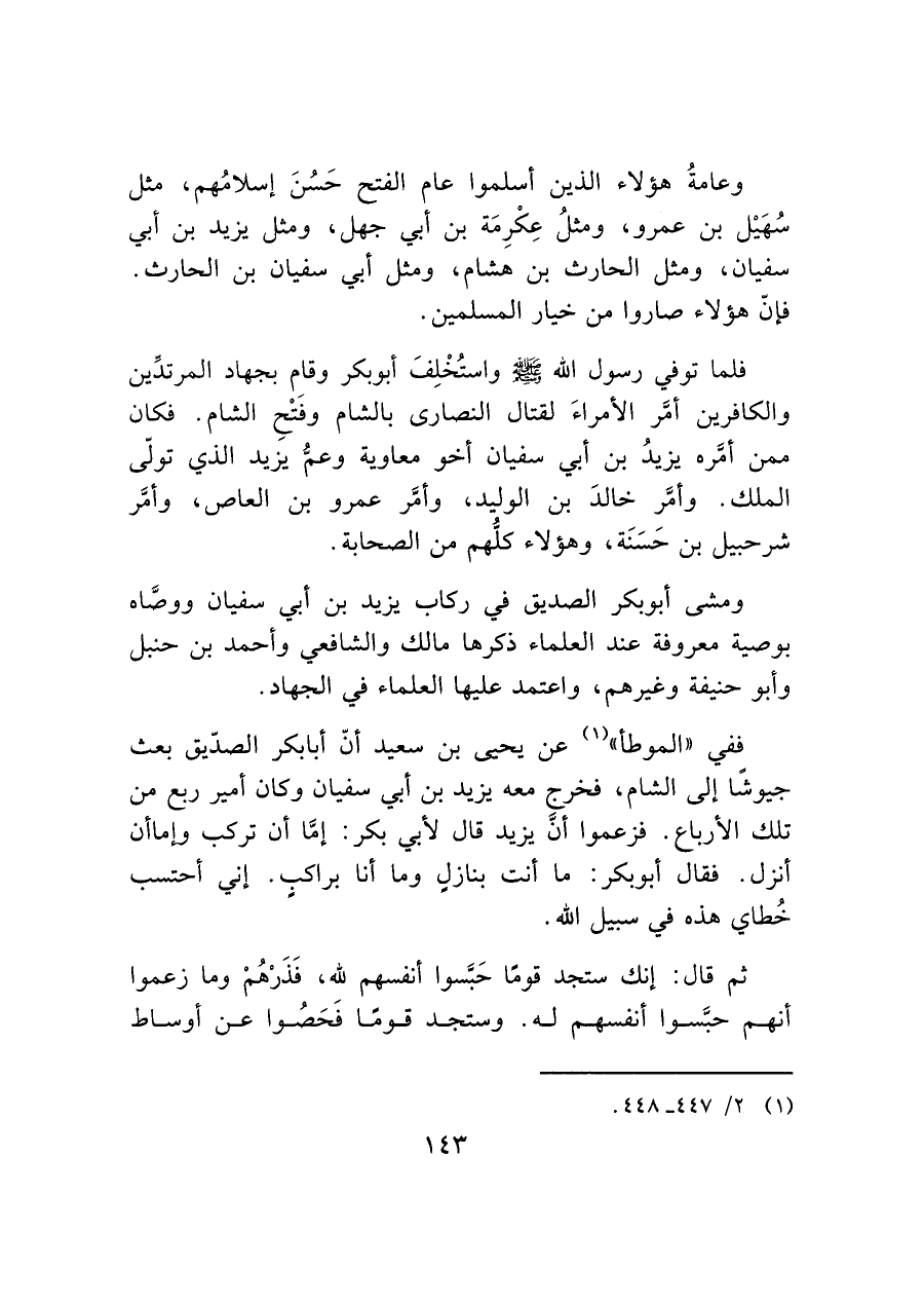 ففي "الموطأ" (¬١) عن يحيى بن سعيد أنّ أبا بكر الصدّيق بعث جيوشًا إلى الشام، فخرج معه يزيد بن أبي سفيان وكان أمير ربع من تلك الأرباع. فزعموا أنَّ يزيد قال لأبي بكر: إمَّا أن تركب وإما أن أنزل. فقال أبو بكر: ما أنت بنازل وما أنا براكب. إني أحتسب خُطاي هذه في سبيل الله.