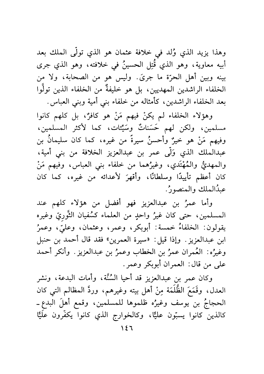 وأما عمرُ بن عبد العزيز فهو أفضل من هؤلاء كلهم عند المسلمين، حتى كان غيرُ واحد من العلماء كسُفيان الثَّورِيّ وغيره يقولون: الخلفاءُ خمسة: أبو بكر، وعمر، وعثمان، وعليّ، وعمرُ ابن عبد العزيز. وإذا قيل: "سيرة العمرين" فقد قال أحمد بن حنبل وغيرُه: العُمران عمرُ بن الخطاب وعمرُ بن عبد العزيز. وأنكر أحمد على من قال: العمران أبو بكر وعمر.