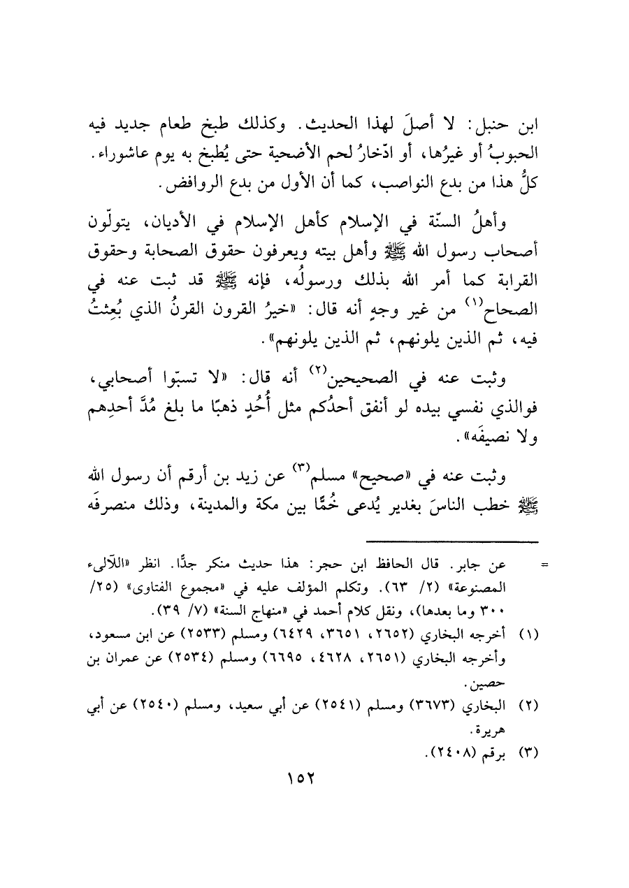 وأهلُ السنّة في الإسلام كأهل الإسلام في الأديان، يتولّون أصحاب رسول الله - صَلَّى اللَّهُ عَلَيْهِ وَسَلَّمَ - وأهل بيته ويعرفون حقوق الصحابة وحقوق القرابة كما أمر الله بذلك ورسولُه، فإنه - صَلَّى اللَّهُ عَلَيْهِ وَسَلَّمَ - قد ثبت عنه في الصحاح (¬١) من غير وجهٍ أنه قال: "خيرُ القرون القرنُ الذي بُعِثتُ فيه، ثم الذين يلونهم، ثم الذين يلونهم".