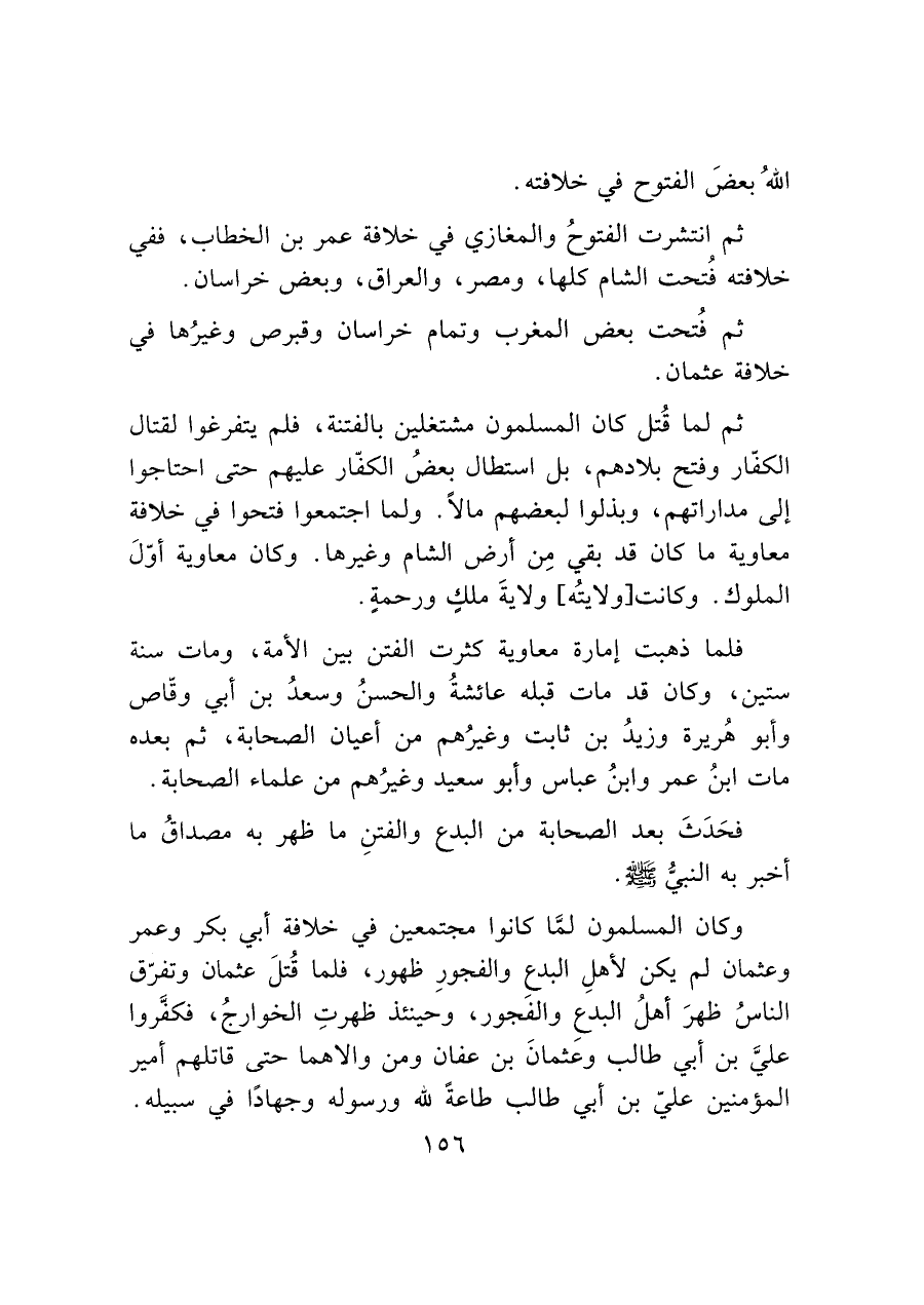 وكان المسلمون لمَّا كانوا مجتمعين في خلافة أبي بكر وعمر وعثمان لم يكن لأهلِ البدع والفجورِ ظهور، فلما قُتلَ عثمان وتفرّق الناسُ ظهرَ أهلُ البدع والفَجور، وحينئذ ظهرتِ الخوارجُ، فكفَّروا عليَّ بن أبي طالب وعَثمانَ بن عفان ومن والاهما حتى قاتلهم أمير المؤمنين عليّ بن أبي طالب طاعةً لله ورسوله وجهادًا في سبيله.