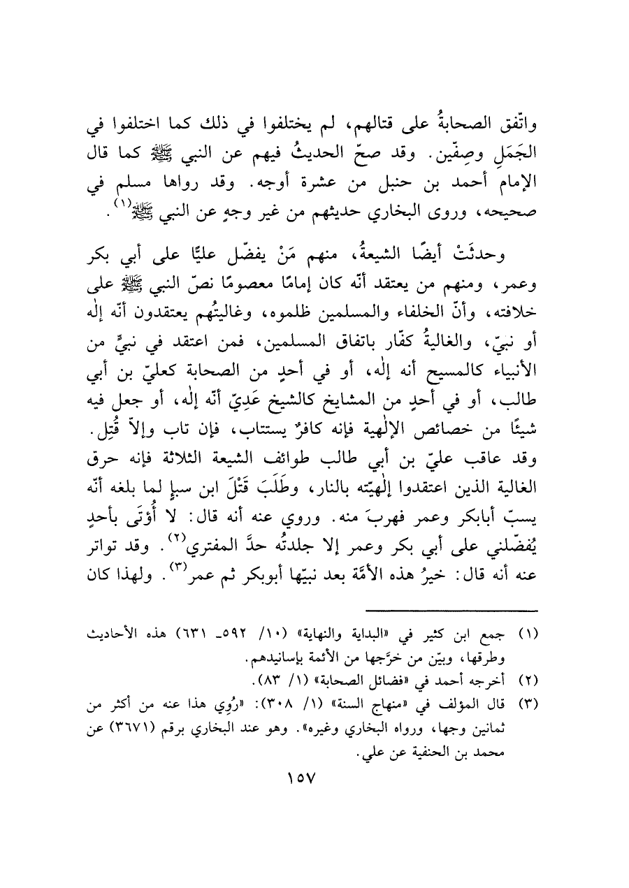 (¬٣) قال المؤلف في "منهاج السنة" (١/ ٣٠٨): "رُوِي هذا عنه من أكثر من ثمانين وجها، ورواه البخاري وغيره". وهو عند البخاري برقم (٣٦٧١) عن محمد بن الحنفية عن علي.
