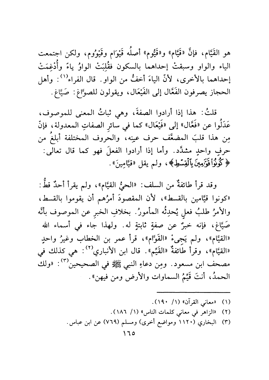 هو القَيَّام، فإنَّ "قَيَّام" و"قَيُّوم" أصلُه قَيْوَام وقَيْوُوم، ولكن اجتمعت الياء والواو وسبقتْ إحداهما بالسكون فقُلِبَتْ الواوُ ياءً وأُدْغِمَتْ إحداهما بالأخرى، لأنّ الياءَ أخفُّ من الواو. قال الفراء (¬١): وأهل الحجاز يصرفون الفَعَّال إلى الفَيْعَال، ويقولون للصوَّاغ: صَيَّاغ.