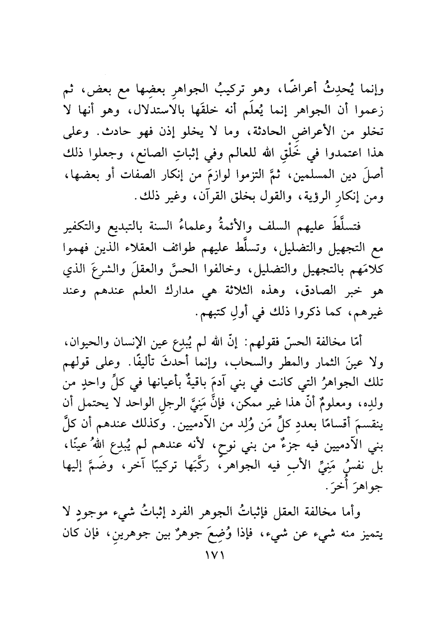 وإنما يُحدِثُ أعراضًا، وهو تركيبُ الجواهرِ بعضِها مع بعض، ثم زعموا أن الجواهر إنما يُعلَم أنه خلقَها بالاستدلال، وهو أنها لا تخلو من الأعراضِ الحادثة، وما لا يخلو إذن فهو حادث. وعلى هذا اعتمدوا في خَلْقِ الله للعالم وفي إثباتِ الصانع، وجعلوا ذلك أصلَ دين المسلمين، ثمَّ التزموا لوازمَ من إنكار الصفات أو بعضها، ومن إنكارِ الرؤية، والقول بخلق القرآن، وغير ذلك.