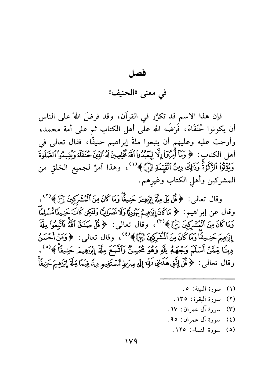 وقال تعالى: (قُلْ بَلْ مِلَّةَ إِبْرَاهِيمَ حَنِيفًا وَمَا كَانَ مِنَ الْمُشْرِكِينَ (١٣٥)) (¬٢) وقال عن إبراهيم: (مَا كَانَ إِبْرَاهِيمُ يَهُودِيًّا وَلَا نَصْرَانِيًّا وَلَكِنْ كَانَ حَنِيفًا مُسْلِمًا وَمَا كَانَ مِنَ الْمُشْرِكِينَ (٦٧)) (¬٣)، وقال تعالى: (قُلْ صَدَقَ اللَّهُ فَاتَّبِعُوا مِلَّةَ إِبْرَاهِيمَ حَنِيفًا وَمَا كَانَ مِنَ الْمُشْرِكِينَ (٩٥)) (¬٤)، وقال تعالى: (وَمَنْ أَحْسَنُ دِينًا مِمَّنْ أَسْلَمَ وَجْهَهُ لِلَّهِ وَهُوَ مُحْسِنٌ وَاتَّبَعَ مِلَّةَ إِبْرَاهِيمَ حَنِيفًا) (¬٥)، وقال تعالى: (قُلْ إِنَّنِي هَدَانِي رَبِّي إِلَى صِرَاطٍ مُسْتَقِيمٍ دِينًا قِيَمًا مِلَّةَ إِبْرَاهِيمَ حَنِيفًا