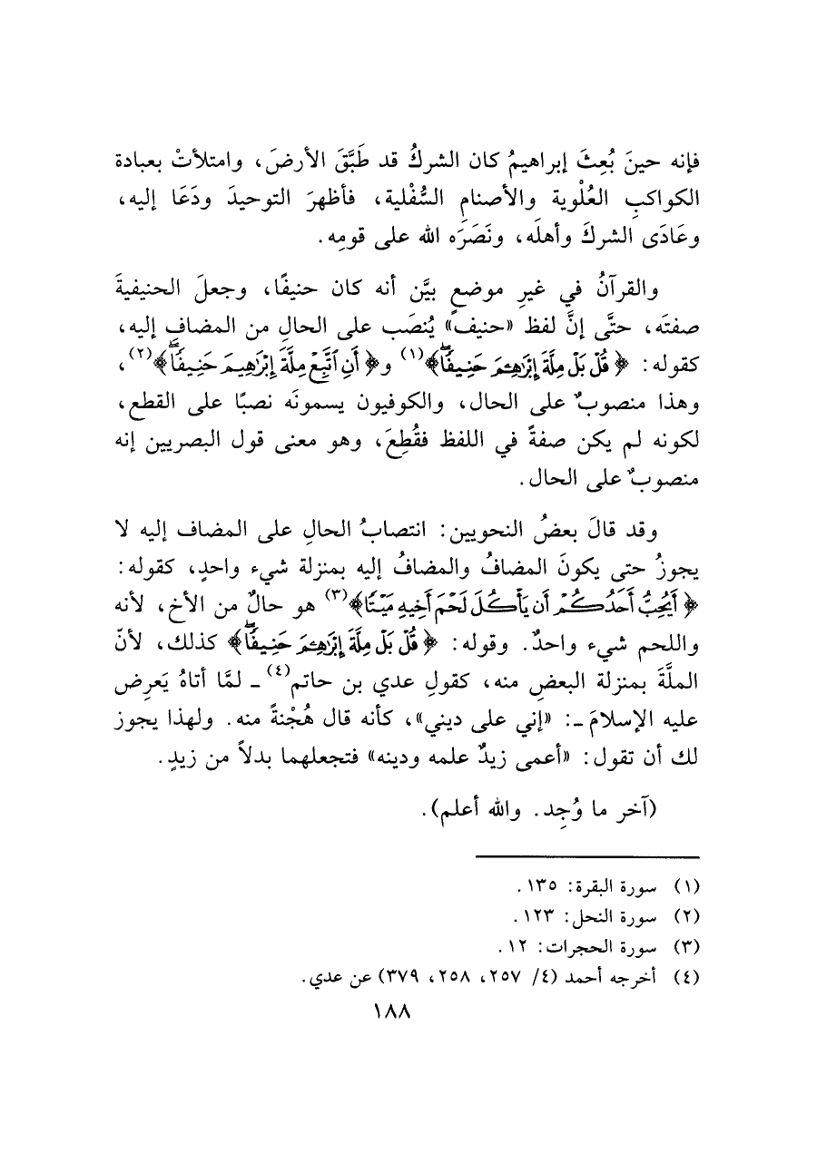 والقرآنُ في غيرِ موضعٍ بيَّن أنه كان حنيفًا، وجعلَ الحنيفيةَ صفتَه، حتَّى إنَّ لفظ "حنيف" يُنصَب على الحال من المضاف إليه، كقوله: (قُلْ بَلْ مِلَّةَ إِبْرَاهِيمَ حَنِيفًا) (¬١) و (أَنِ اتَّبِعْ مِلَّةَ إِبْرَاهِيمَ حَنِيفًا) (¬٢)، وهذا منصوبٌ على الحال، والكوفيون يسمونَه نصبًا على القطع، لكونه لم يكن صفةً في اللفظ فقُطِعَ، وهو معنى قول البصريين إنه منصوب على الحال.