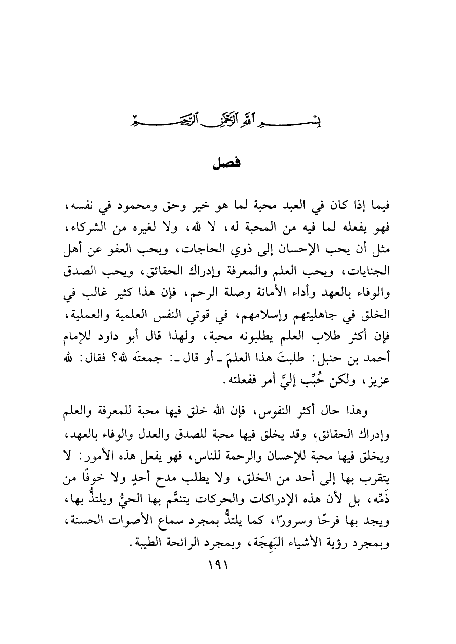 وهذا حال أكثر النفوس، فإن الله خلق فيها محبة للمعرفة والعلم وإدراك الحقائق، وقد يخلق فيها محبة للصدق والعدل والوفاء بالعهد، ويخلق فيها محبة للإحسان والرحمة للناس، فهو يفعل هذه الأمور: لا يتقرب بها إلى أحد من الخلق، ولا يطلب مدح أحدٍ ولا خوفًا من ذَمِّه، بل لأن هذه الإدراكات والحركات يتنعَّم بها الحيُّ ويلتذُّ بها، ويجد بها فرحًا وسرورًا، كما يلتذُّ بمجرد سماع الأصوات الحسنة، وبمجرد رؤية الأشياء البَهِجَة، وبمجرد الرائحة الطيبة.