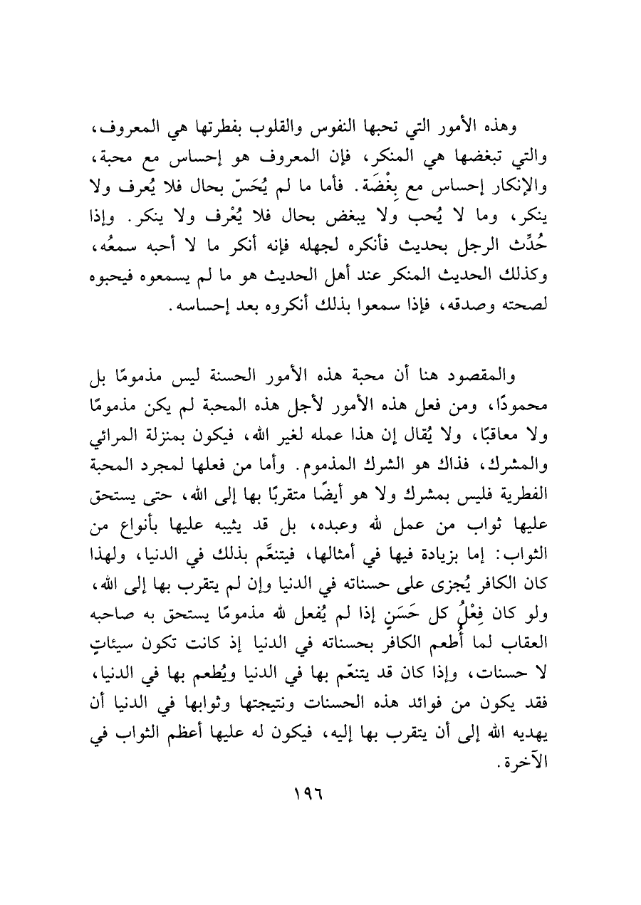 والمقصود هنا أن محبة هذه الأمور الحسنة ليس مذمومًا بل محمودًا، ومن فعل هذه الأمور لأجل هذه المحبة لم يكن مذمومًا ولا معاقبًا، ولا يُقال إن هذا عمله لغير الله، فيكون بمنزلة المرائي والمشرك، فذاك هو الشرك المذموم. وأما من فعلها لمجرد المحبة الفطرية فليس بمشرك ولا هو أيضًا متقربًا بها إلى الله، حتى يستحق عليها ثواب من عمل لله وعبده، بل قد يثيبه عليها بأنواع من الثواب: إما بزيادة فيها في أمثالها، فيتنعَّم بذلك في الدنيا، ولهذا كان الكافر يُجزى على حسناته في الدنيا وإن لم يتقرب بها إلى الله، ولو كان فِعْل كل حَسَنٍ إذا لم يُفعل لله مذمومًا يستحق به صاحبه العقاب لما أطعم الكافر بحسناته في الدنيا إذا كانت تكون سيئاتٍ لا حسنات، وإذا كان قد يتنعّم بها في الدنيا ويُطعم بها في الدنيا، فقد يكون من فوائد هذه الحسنات ونتيجتها وثوابها في الدنيا أن يهديه الله إلى أن يتقرب بها إليه، فيكون له عليها أعظم الثواب في الآخرة.