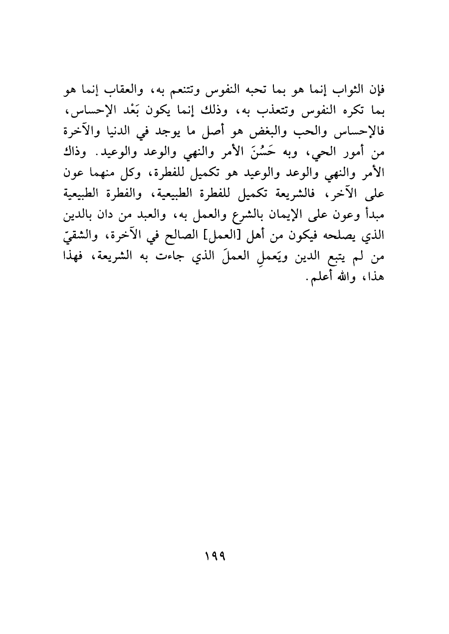 فإن الثواب إنما هو بما تحبه النفوس وتتنعم به، والعقاب إنما هو بما تكره النفوس وتتعذب به، وذلك إنما يكون بَعْد الإحساس، فالإحساس والحب والبغض هو أصل ما يوجد في الدنيا والآخرة من أمور الحي، وبه حَسُنَ الأمر والنهي والوعد والوعيد. وذاك الأمر والنهي والوعد والوعيد هو تكميل للفطرة، وكل منهما عون على الآخر، فالشريعة تكميل للفطرة الطبيعية، والفطرة الطبيعية مبدأ وعون على الإيمان بالشرع والعمل به، والعبد من دان بالدين الذي يصلحه فيكون من أهل [العمل] الصالح في الآخرة، والشقيّ من لم يتبع الدين ويَعملِ العملَ الذي جاءت به الشريعة، فهذا هذا، والله أعلم.