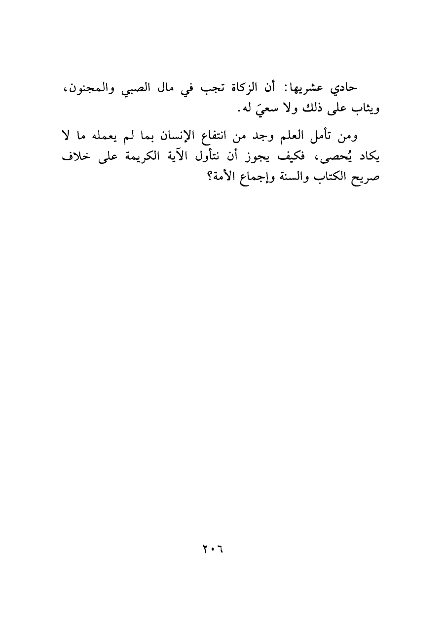 حادي عشريها: أن الزكاة تجب في مال الصبي والمجنون، ويثاب على ذلك ولا سعيَ له.