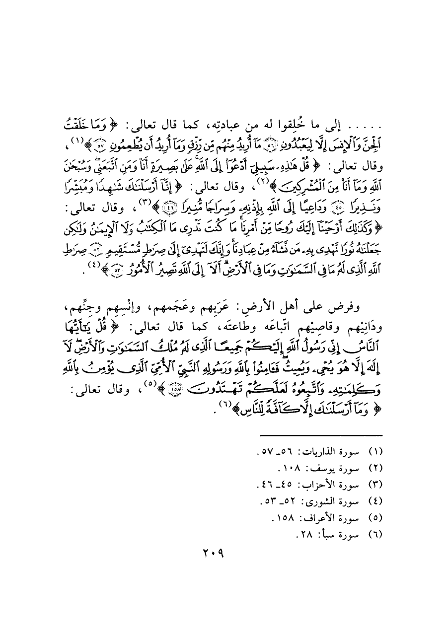 وفرض على أهل الأرضِ: عَرَبِهم وعَجَمهم، وإنْسِهم وجنَهم، ودَانِيْهم وقاصيْهم اتّباعَه وطاعتَه، كما قال تعالى: (قُلْ يَا أَيُّهَا النَّاسُ إِنِّي رَسُولُ اللَّهِ إِلَيْكُمْ جَمِيعًا الَّذِي لَهُ مُلْكُ السَّمَاوَاتِ وَالْأَرْضِ لَا إِلَهَ إِلَّا هُوَ يُحْيِي وَيُمِيتُ فَآَمِنُوا بِاللَّهِ وَرَسُولِهِ النَّبِيِّ الْأُمِّيِّ الَّذِي يُؤْمِنُ بِاللَّهِ وَكَلِمَاتِهِ وَاتَّبِعُوهُ لَعَلَّكُمْ تَهْتَدُونَ (١٥٨)) (¬٥)، وقال تعالى: (وَمَا أَرْسَلْنَاكَ إِلَّا كَافَّةً لِلنَّاسِ) (¬٦).