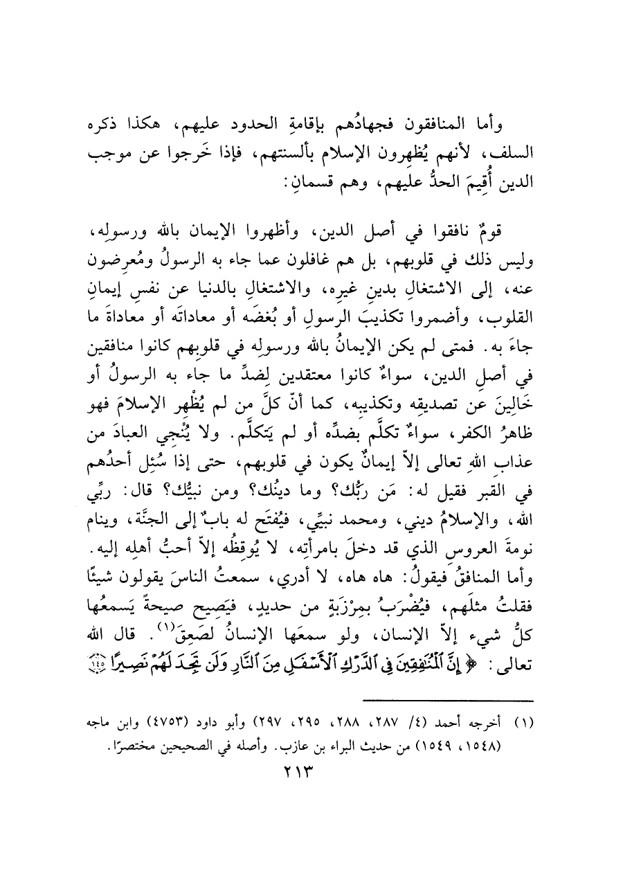 قوم نافقوا في أصل الدين، وأظهروا الإيمان بالله ورسوله، وليس ذلك في قلوبهم، بل هم غافلون عما جاء به الرسولُ ومُعرِضون عنه، إلى الاشتغالِ بدينِ غيرِه، والاشتغالِ بالدنيا عن نفسِ إيمانِ القلوب، وأضمروا تكذيبَ الرسولِ أو بُغضه أو معاداتَه أو معاداة ما جاءَ به. فمتى لم يكن الإيمانُ بالله ورسوله في قلوبِهم كانوا منافقين في أصلِ الدين، سواءٌ كانوا معتقدين لِضدِّ ما جاء به الرسولُ أو خَالِينَ عن تصديقِه وتكذيبه، كما أنّ كلَّ من لم يُظْهِر الإسلامَ فهو ظاهرُ الكفر، سواء تكلَّم بَضدِّه أو لم يَتكلَّم. ولا يُنْجِي العبادَ من عذاب الله تعالى إلاّ إيمان يكون في قلوبهم، حتى إذا سُئِل أحدُهم في الَقبر فقيل له: مَن ربُّك؟ وما دينُك؟ ومن نبيُّك؟ قال: ربِّي الله، والإسلامُ ديني، ومحمد نبيِّي، فيُفتَح له باب إلى الجنَّة، وينام نومةَ العروسِ الذي قد دخلَ بامرأتِه، لا يُوقِظُه إلاّ أحبُّ أهلِه إليه.