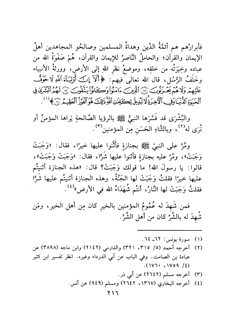 فأبرارُهم هم أئمَّةُ الدِّين وهداةُ المسلمين وصالحُو المجاهدين أهلُ الإيمان والقرآن؛ والحاملُ النَّاصرُ للإيمان والقرآن، هُمْ صَفْوَةُ الله من عباده وخِيَرَتُه من خلقِه، وموضعُ نظرِ اللهِ إلى الأرضِ، وورثةُ الأنبياء وخَلَفُ الرُّسُل، قال الله تعالى فيهم: (أَلَا إِنَّ أَوْلِيَاءَ اللَّهِ لَا خَوْفٌ عَلَيْهِمْ وَلَا هُمْ يَحْزَنُونَ (٦٢) الَّذِينَ آَمَنُوا وَكَانُوا يَتَّقُونَ (٦٣) لَهُمُ الْبُشْرَى فِي الْحَيَاةِ الدُّنْيَا وَفِي الْآَخِرَةِ لَا تَبْدِيلَ لِكَلِمَاتِ اللَّهِ ذَلِكَ هُوَ الْفَوْزُ الْعَظِيمُ (٦٤)) (¬١).