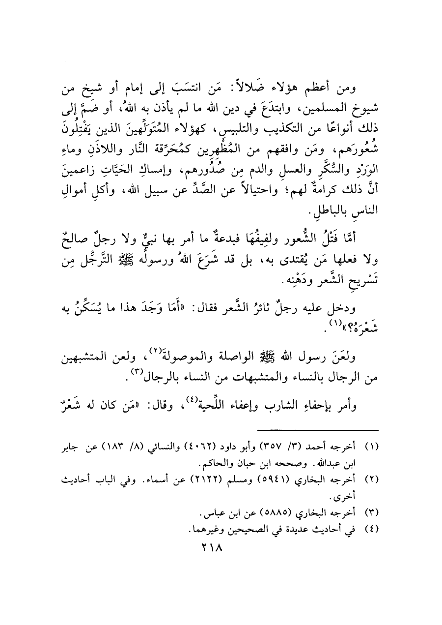 ومن أعظم هؤلاء ضَلالاً: مَن انتسَبَ إلى إمام أو شيخ من شيوخ المسلمين، وابتدَعَ في دين الله ما لم يأذن به الله، أو ضَمَّ إلى ذلك أنواعًا من التكذيب والتلبيسِ، كهؤلاء المُتَوَلِّهينَ الذين يَفْتِلُونَ شُعُورَهم، ومَن وافقهم من المُظْهِرِين كمُحَرقة النَّار واللاذَنِ وماءِ الوَرْدِ والسُّكَّرِ والعسلِ والدم مِن صُدُورهم، وإمساكِ الحَياتِ زاعمينَ أنَّ ذلك كرامة لهم؛ واحتيالاً عن الصدِّ عن سبيل الله، وأكلِ أموال الناسِ بالباطلِ.
