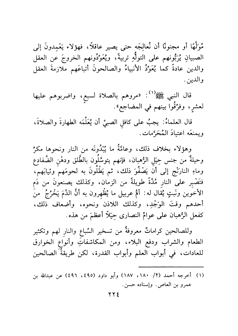 قال النبي - صَلَّى اللَّهُ عَلَيْهِ وَسَلَّمَ - (¬١): "مروهم بالصلاة لسبعٍ، واضربوهم عليها لعشرٍ، وفرِّقُوا بينهم في المضاجع".