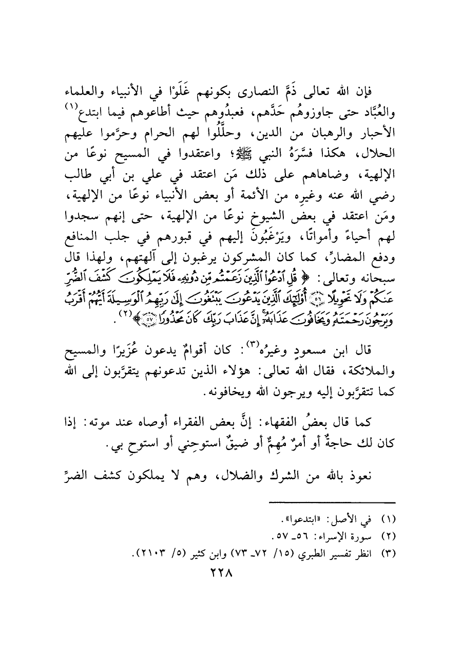 فإن الله تعالى ذَمَّ النصارى بكونهم غَلَوْا في الأنبياء والعلماء والعُبَّاد حتى جاوزوهُم حَدَّهم، فعبدُوهم حيث أطاعوهم فيما ابتدع (¬١) الأحبار والرهبان من الدين، وحللُوا لهم الحرام وحرَّموا عليهم الحلال، هكذا فسَّرَهُ النبي - صَلَّى اللَّهُ عَلَيْهِ وَسَلَّمَ -؛ واعتقدوا في المسيح نوعًا من الإلهية، وضاهاهم على ذلك مَن اعتقد في علي بن أبي طالب رضي الله عنه وغيرِه من الأئمة أو بعض الأنبياء نوعًا من الإلهية، ومَن اعتقد في بعض الشيوخ نوعًا من الإلهية، حتى إنهم سجدوا لهم أحياءً وأمواتًا، ويَرْغَبُونَ إليهم في قبورهم في جلب المنافع ودفع المضارِّ، كما كان المشرِكون يرغبون إلى آلهتهم، ولهذا قال سبحانه وتعالى: (قُلِ ادْعُوا الَّذِينَ زَعَمْتُمْ مِنْ دُونِهِ فَلَا يَمْلِكُونَ كَشْفَ الضُّرِّ عَنْكُمْ وَلَا تَحْوِيلًا (٥٦) أُولَئِكَ الَّذِينَ يَدْعُونَ يَبْتَغُونَ إِلَى رَبِّهِمُ الْوَسِيلَةَ أَيُّهُمْ أَقْرَبُ وَيَرْجُونَ رَحْمَتَهُ وَيَخَافُونَ عَذَابَهُ إِنَّ عَذَابَ رَبِّكَ كَانَ مَحْذُورًا (٥٧)) (¬٢).