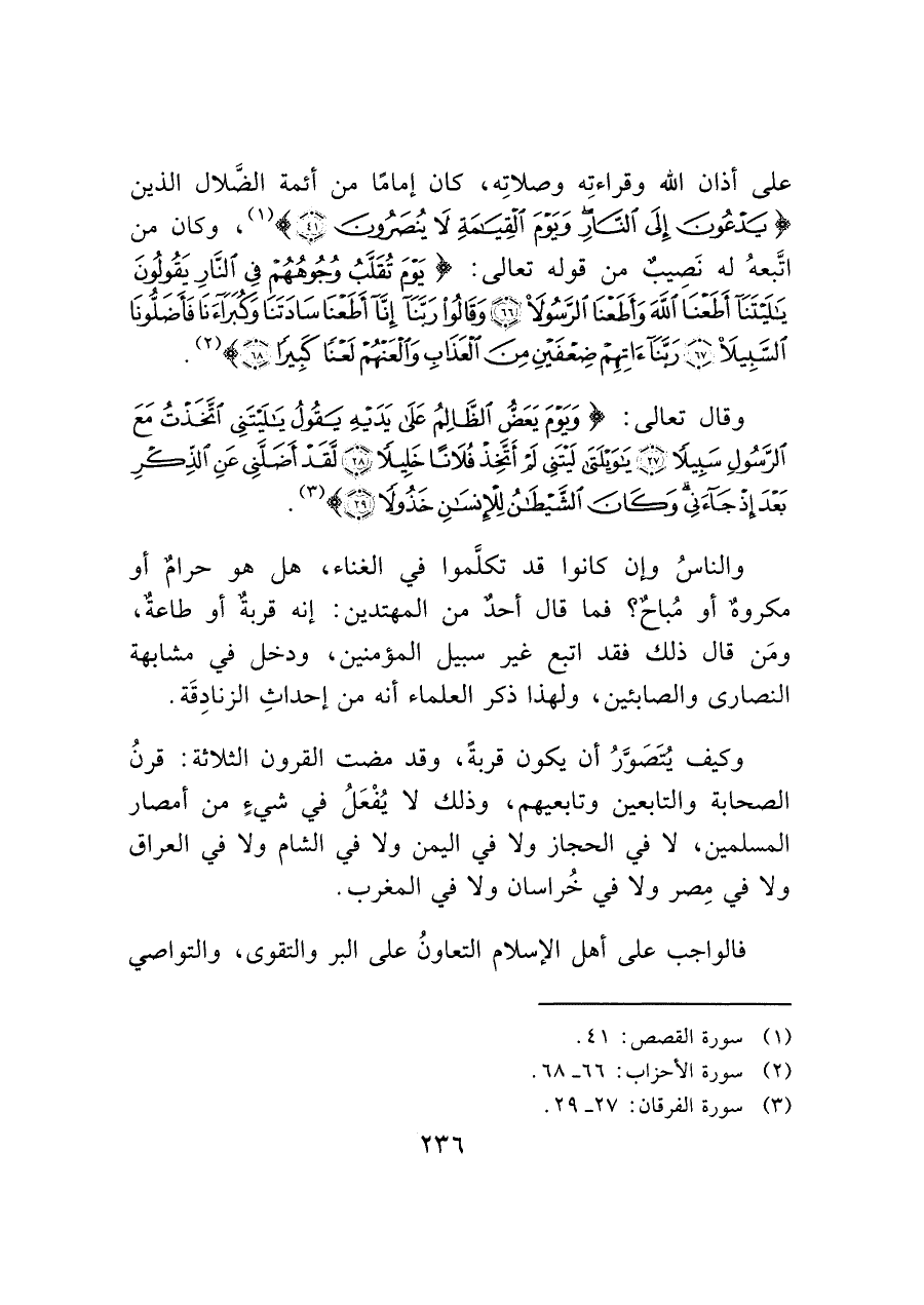 على أذان الله وقراءتِه وصلاتِه، كان إمامًا من أئمة الضَّلال الذين (يَدْعُونَ إِلَى النَّارِ وَيَوْمَ الْقِيَامَةِ لَا يُنْصَرُونَ (٤١)) (¬١)، وكان من اتَّبعهُ له نَصِيبٌ من قوله تعالى: (يَوْمَ تُقَلَّبُ وُجُوهُهُمْ فِي النَّارِ يَقُولُونَ يَا لَيْتَنَا أَطَعْنَا اللَّهَ وَأَطَعْنَا الرَّسُولَا (٦٦) وَقَالُوا رَبَّنَا إِنَّا أَطَعْنَا سَادَتَنَا وَكُبَرَاءَنَا فَأَضَلُّونَا السَّبِيلَا (٦٧) رَبَّنَا آَتِهِمْ ضِعْفَيْنِ مِنَ الْعَذَابِ وَالْعَنْهُمْ لَعْنًا كَبِيرًا (٦٨)) (¬٢).