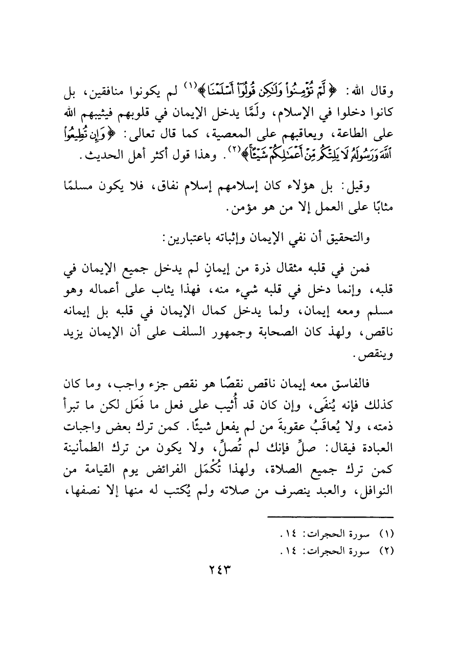 وقال الله: (لَمْ تُؤْمِنُوا وَلَكِنْ قُولُوا أَسْلَمْنَا) (¬١) لم يكونوا منافقين، بل كانوا دخلوا في الإسلام، ولَمَّا يدخل الإيمان في قلوبهم فيثيبهم الله على الطاعة، ويعاقبهم على المعصية، كما قال تعالى: (وَإِنْ تُطِيعُوا اللَّهَ وَرَسُولَهُ لَا يَلِتْكُمْ مِنْ أَعْمَالِكُمْ شيئًا) (¬٢). وهذا قول أكثر أهل الحديث.