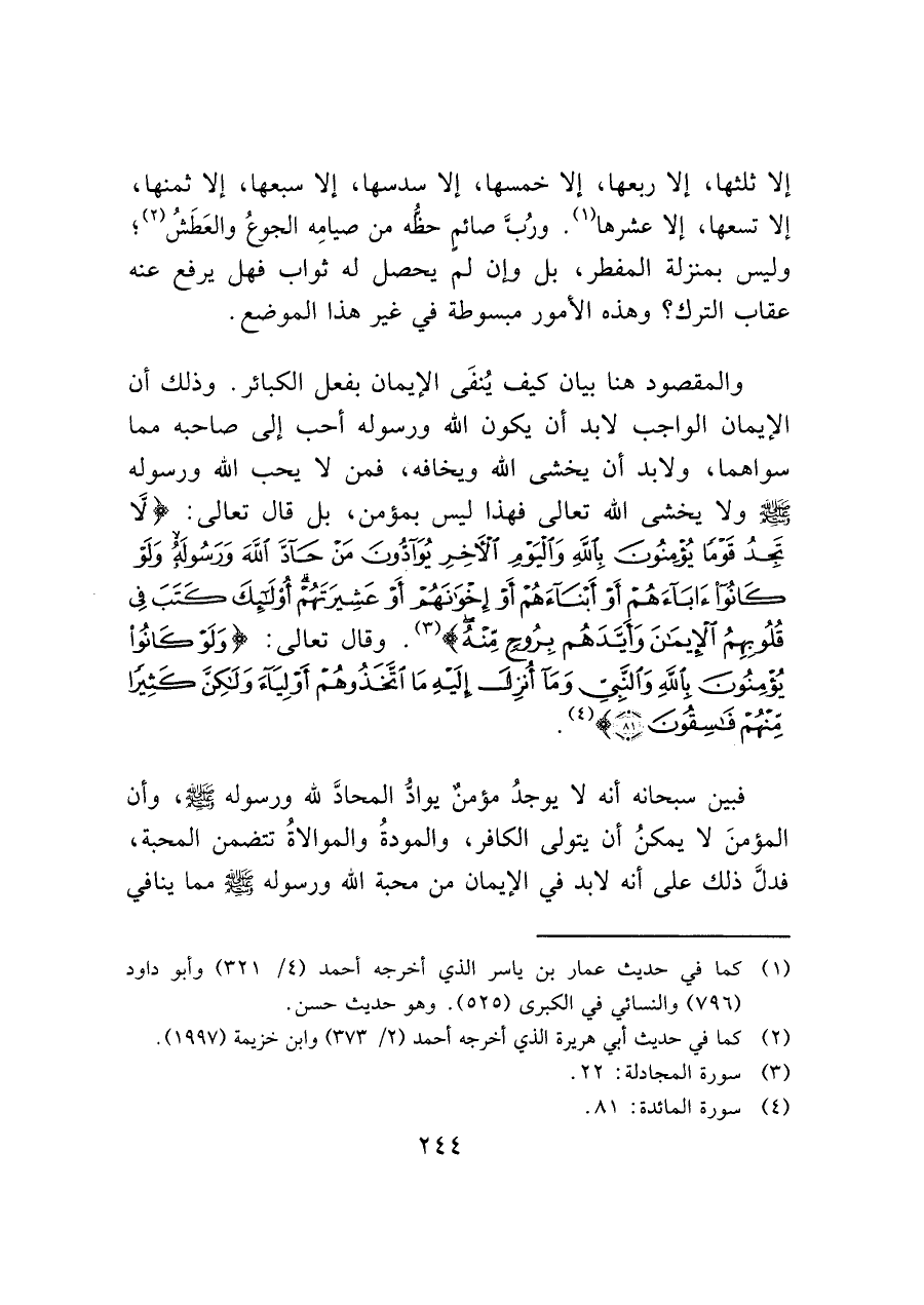 والمقصود هنا بيان كيف يُنفَى الإيمان بفعل الكبائر. وذلك أن الإيمان الواجب لابد أن يكون الله ورسوله أحب إلى صاحبه مما سواهما، ولابد أن يخشى الله ويخافه، فمن لا يحب الله ورسوله - صَلَّى اللَّهُ عَلَيْهِ وَسَلَّمَ - ولا يخشى الله تعالى فهذا ليس بمؤمن، بل قال تعالى: (لَا تَجِدُ قَوْمًا يُؤْمِنُونَ بِاللَّهِ وَالْيَوْمِ الْآَخِرِ يُوَادُّونَ مَنْ حَادَّ اللَّهَ وَرَسُولَهُ وَلَوْ كَانُوا آَبَاءَهُمْ أَوْ أَبْنَاءَهُمْ أَوْ إِخْوَانَهُمْ أَوْ عَشِيرَتَهُمْ أُولَئِكَ كَتَبَ فِي قُلُوبِهِمُ الْإِيمَانَ وَأَيَّدَهُمْ بِرُوحٍ مِنْهُ) (¬٣). وقال تعالى: (وَلَوْ كَانُوا يُؤْمِنُونَ بِاللَّهِ وَالنَّبِيِّ وَمَا أُنْزِلَ إِلَيْهِ مَا اتَّخَذُوهُمْ أَوْلِيَاءَ وَلَكِنَّ كَثِيرًا مِنْهُمْ فَاسِقُونَ (٨١)) (¬٤).