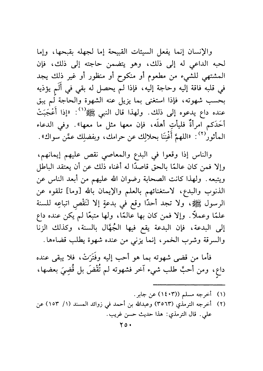 والإنسان إنما يفعل السيئات القبيحة إما لجهله بقبحها، وإما لحبه الداعي له إلى ذلك، وهو يتضمن حاجته إلى ذلك، فإن المشتهي للشيء من مطعوم أو منكوح أو منظور أو غير ذلك يجد في قلبه فاقة إليه وحاجة إليه، فإذا لم يحصل له بقي في ألمٍ يؤذيه بحسب شهوته، فإذا استغنى بما يزيل عنه الشهوة والحاجة لم يبق عنده داع يدعوه إلى ذلك. ولهذا قال النبي - صَلَّى اللَّهُ عَلَيْهِ وَسَلَّمَ - (¬١): "إذا أَعْجَبَتْ أحَدَكم امرأة فليأتِ أهلَه، فإن معها مثل ما معها". وفي الدعاء المأثور (¬٢): "اللهمَّ أَغْنِنَا بحلالِك عن حرامك، وبفضلِك عمَّن سواك".