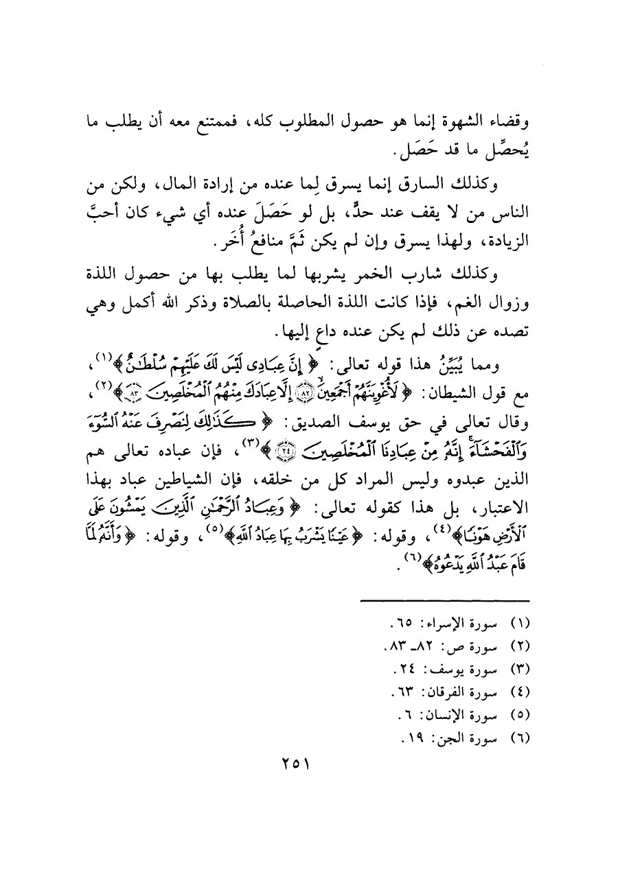 ومما يُبيِّنُ هذا قوله تعالى: (إِنَّ عِبَادِي لَيْسَ لَكَ عَلَيْهِمْ سُلْطَانٌ) (¬١)، مع قول الشيطان: (لَأُغْوِيَنَّهُمْ أَجْمَعِينَ (٨٢) إِلَّا عِبَادَكَ مِنْهُمُ الْمُخْلَصِينَ (٨٣)) (¬٢)، وقال تعالى في حق يوسف الصديق: (كَذَلِكَ لِنَصْرِفَ عَنْهُ السُّوءَ وَالْفَحْشَاءَ إِنَّهُ مِنْ عِبَادِنَا الْمُخْلَصِينَ (٢٤)) (¬٣)، فإن عباده تعالى هم الذين عبدوه وليس المراد كل من خلقه، فإن الشياطين عباد بهذا الاعتبار، بل هذا كقوله تعالى: (وَعِبَادُ الرَّحْمَنِ الَّذِينَ يَمْشُونَ عَلَى الْأَرْضِ هَوْنًا) (¬٤)، وقوله: (عَيْنًا يَشْرَبُ بِهَا عِبَادُ اللَّهِ) (¬٥)، وقوله: (وَأَنَّهُ لَمَّا قَامَ عَبْدُ اللَّهِ يَدْعُوهُ) (¬٦).
