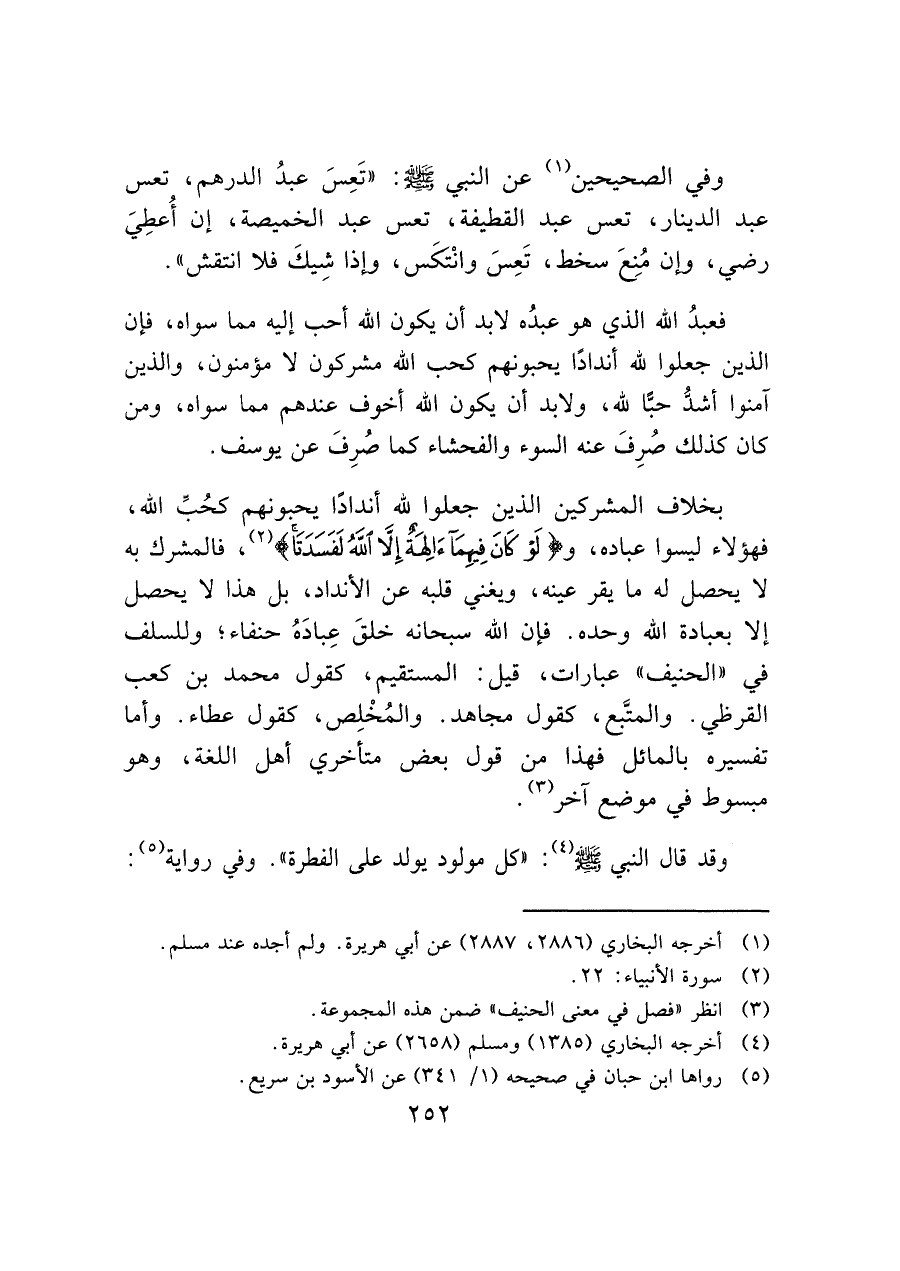 بخلاف المشركين الذين جعلوا لله أندادًا يحبونهم كحُب الله، فهؤلاء ليسوا عباده، و (لَوْ كَانَ فِيهِمَا آَلِهَةٌ إِلَّا اللَّهُ لَفَسَدَتَا) (¬٢)، فالمشرك به لا يحصل له ما يقر عينه، ويغني قلبه عن الأنداد، بل هذا لا يحصل إلا بعبادة الله وحده. فإن الله سبحانه خلقَ عِبادَهُ حنفاء؛ وللسلف في "الحنيف" عبارات، قيل: المستقيم، كقول محمد بن كعب القرظي. والمتَّبع، كقول مجاهد. والمُخْلِص، كقول عطاء. وأما تفسيره بالمائل فهذا من قول بعض متأخري أهل اللغة، وهو مبسوط في موضع آخر (¬٣).