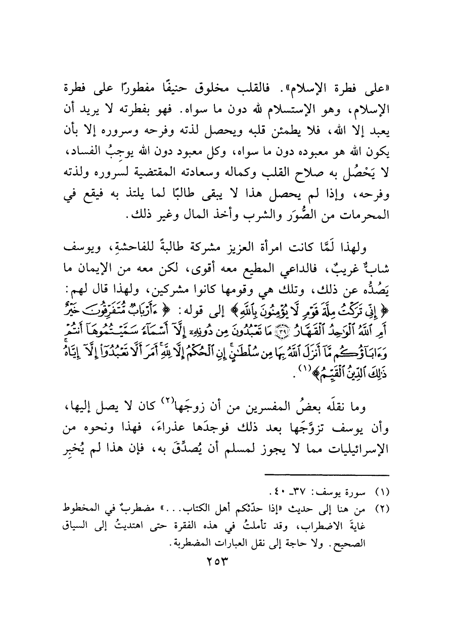 ولهذا لَمَّا كانت امرأة العزيز مشركة طالبةً للفاحشةِ، ويوسف شاب غريبٌ، فالداعي المطيع معه أقوى، لكن معه من الإيمان ما يَصدُّه عن ذلك، وتلك هي وقومها كانوا مشركين، ولهذا قال لهم: (إِنِّي تَرَكْتُ مِلَّةَ قَوْمٍ لَا يُؤْمِنُونَ بِاللَّهِ) إلى قوله: (أَأَرْبَابٌ مُتَفَرِّقُونَ خَيْرٌ أَمِ اللَّهُ الْوَاحِدُ الْقَهَّارُ (٣٩) مَا تَعْبُدُونَ مِنْ دُونِهِ إِلَّا أَسْمَاءً سَمَّيْتُمُوهَا أَنْتُمْ وَآَبَاؤُكُمْ مَا أَنْزَلَ اللَّهُ بِهَا مِنْ سُلْطَانٍ إِنِ الْحُكْمُ إِلَّا لِلَّهِ أَمَرَ أَلَّا تَعْبُدُوا إِلَّا إِيَّاهُ ذَلِكَ الدِّينُ الْقَيِّمُ) (¬١).