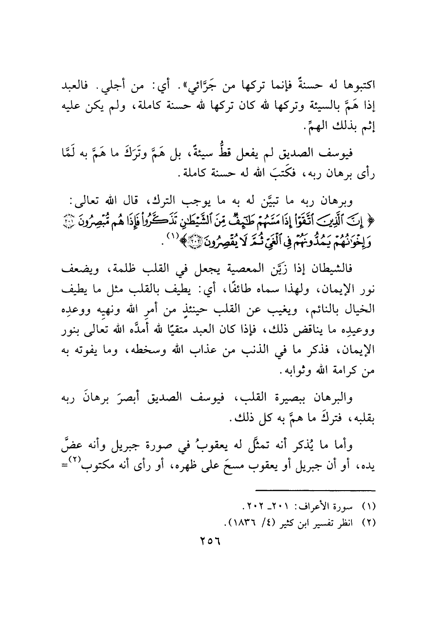 وبرهان ربه ما تبيَّن له به ما يوجب الترك، قال الله تعالى: (إِنَّ الَّذِينَ اتَّقَوْا إِذَا مَسَّهُمْ طَائِفٌ مِنَ الشَّيْطَانِ تَذَكَّرُوا فَإِذَا هُمْ مُبْصِرُونَ (٢٠١) وَإِخْوَانُهُمْ يَمُدُّونَهُمْ فِي الْغَيِّ ثُمَّ لَا يُقْصِرُونَ (٢٠٢)) (¬١).