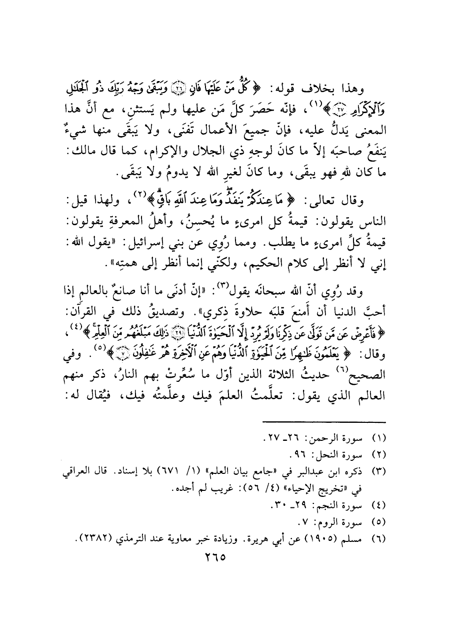 وقد رُوِي أنّ الله سبحانَه يقول (¬٣): "إنّ أدنَى ما أنا صانعٌ بالعالمِ إذا أحبَّ الدنيا أن أَمنعَ قلبَه حلاوةَ ذِكري". وتصديقُ ذلك في القرآن: (فَأَعْرِضْ عَنْ مَنْ تَوَلَّى عَنْ ذِكْرِنَا وَلَمْ يُرِدْ إِلَّا الْحَيَاةَ الدُّنْيَا (٢٩) ذَلِكَ مَبْلَغُهُمْ مِنَ الْعِلْمِ) (¬٤)، وقال: (يَعْلَمُونَ ظَاهِرًا مِنَ الْحَيَاةِ الدُّنْيَا وَهُمْ عَنِ الْآَخِرَةِ هُمْ غَافِلُونَ) (¬٥). وفي الصحيح (¬٦) حديثُ الثلاثة الذين أوّل ما سُعِّرتْ بهم النارُ، ذكر منهم العالم الذي يقول: تعلَّمتُ العلمَ فيك وعلمتُه فيك، فيُقال له: