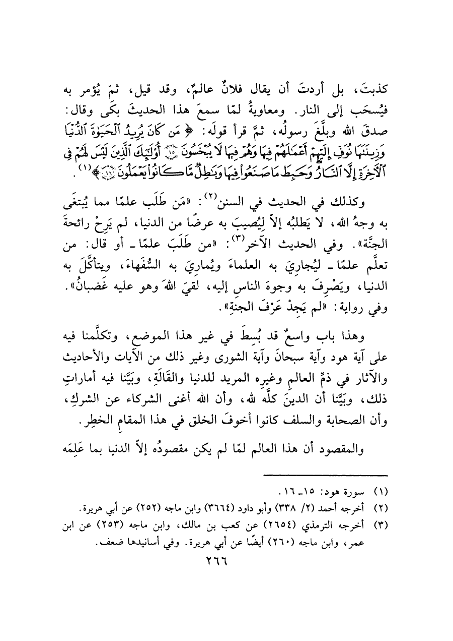 كذبتَ، بل أردتَ أن يقال فلانٌ عالمٌ، وقد قيل، ثمّ يُؤمر به فيُسحَب إلى النار. ومعاويةُ لمّا سمعَ هذا الحديثَ بكَى وقال: صدقَ الله وبلَّغَ رسولُه، ثمَّ قرأ قولَه: (مَنْ كَانَ يُرِيدُ الْحَيَاةَ الدُّنْيَا وَزِينَتَهَا نُوَفِّ إِلَيْهِمْ أَعْمَالَهُمْ فِيهَا وَهُمْ فِيهَا لَا يُبْخَسُونَ (١٥) أُولَئِكَ الَّذِينَ لَيْسَ لَهُمْ فِي الْآَخِرَةِ إِلَّا النَّارُ وَحَبِطَ مَا صَنَعُوا فِيهَا وَبَاطِلٌ مَا كَانُوا يَعْمَلُونَ (١٦)) (¬١).
