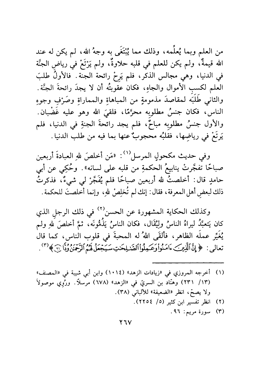 وفي حديث مكحولٍ المرسل (¬١): "مَن أخلصَ لله العبادةَ أربعين صباحًا تفجَّرتْ ينابيعُ الحكمةِ من قلبه على لسانه". وحُكِي عن أبي حامدٍ قال: أخلصتُ لله أربعين صباحًا فلم يُفَجَّرْ لي شيءٌ، فذكرتُ ذلك لبعضِ أهل المعرفة، فقال: إنك لم تُخلِصْ لله، وإنما أخلصتَ للحكمة.