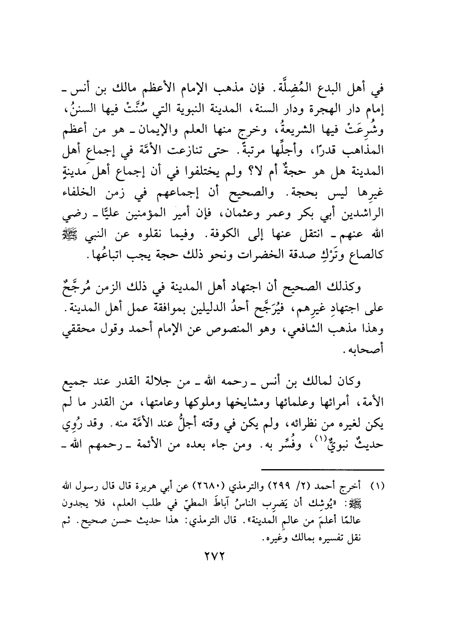 في أهل البدع المُضِلَّة. فإن مذهب الإمام الأعظم مالك بن أنس -إمام دار الهجرة ودار السنة، المدينة النبوية التي سُنَّتْ فيها السننُ، وشُرِعَتْ فيها الشريعةُ، وخرجٍ منها العلم والإيمان- هو من أعظم المذاهب قدرًا، وأجلها مرتبة. حتى تنازعت الأمَّة في إجماع أهل المدينة هل هو حجةٌ أم لا؟ ولم يختلفوا في أن إجماع أهلَ مدينةٍ غيرِها ليس بحجة. والصحيح أن إجماعهم في زمن الخلفاء الراشدين أبي بكر وعمر وعثمان، فإن أمير المؤمنين عليًّا -رضي الله عنهم- انتقل عنها إلى الكوفة. وفيما نقلوه عن النبي - صَلَّى اللَّهُ عَلَيْهِ وَسَلَّمَ - كالصاع وتَرْكِ صدقة الخضرات ونحو ذلك حجة يجب اتباعُها.
