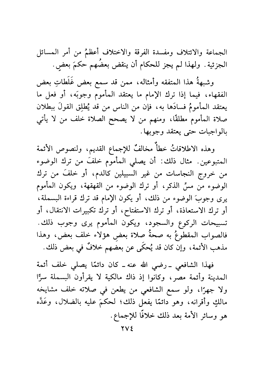 وهذه الاطلاقاتُ خطأٌ مخالفٌ للإجماع القديم، ولنصوص الأئمة المتبوعين. مثال ذلك: أن يصلي المأموم خلفَ من ترك الوضوء من خروج النجاسات من غير السبيلين كالدم، أو خلفَ من ترك الوضوء من مسِّ الذكر، أو ترك الوضوء من القهقهة، ويكون المأموم يرى وجوبَ الوضوء من ذلك، أو يكون الإمام قد ترك قراءة البسملة، أو ترك الاستعاذة، أو ترك الاستفتاح، أو ترك تكبيرات الانتقال، أو تسبيحات الركوع والسجود، ويكون المأموم يرى وجوب ذلك.