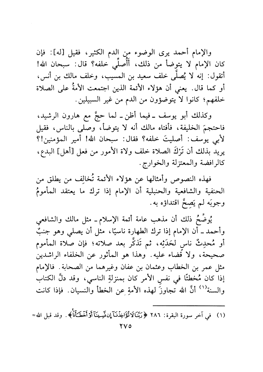 يُوضِّحُ ذلك أن مذهب عامة أئمة الإسلام -مثل مالك والشافعي وأحمد- أن الإمام إذا ترك الطهارة ناسيًا، مثل أن يصلي وهو جنب أو مُحدِث ناسٍ لحَدَثِه، ثم تَذكَّر بعد صلاته؛ فإن صلاة المأموم صحيحة، ولا قضاء عليه. وهذا هو المأثور عن الخلفاء الراشدين مثل عمر بن الخطاب وعثمان بن عفان وغيرهما من الصحابة. فالإمام إذا كان مُخطئًا في نفسِ الأمر كان بمنزلةِ الناسي، وقد دلَّ الكتاب والسنة (¬١) أنَّ الله تجاوزَ لهذه الأمةِ عن الخطأ والنسيان. فإذا كانت