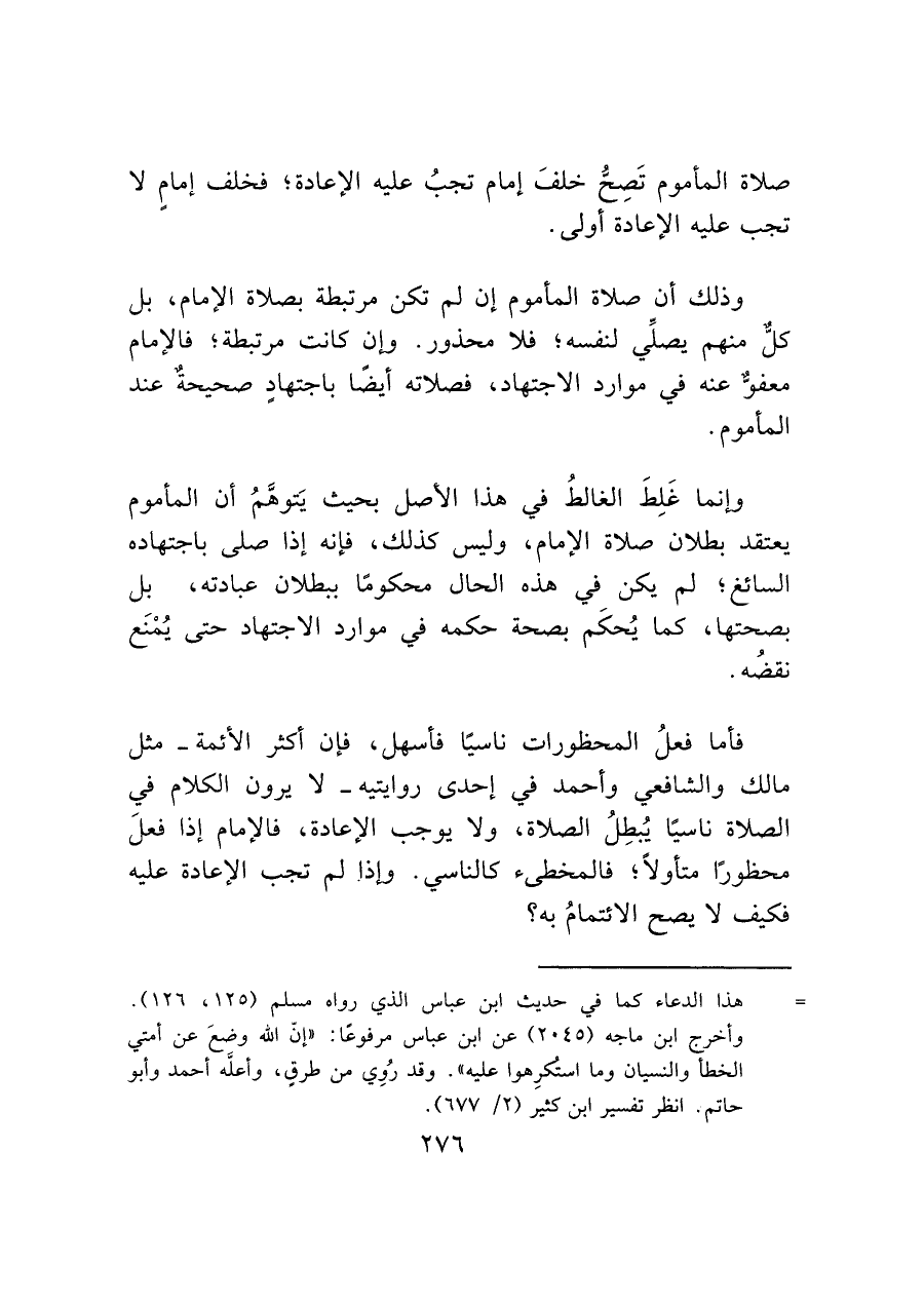 فأما فعلُ المحظورات ناسيًا فأسهل، فإن أكثر الأئمة -مثل مالك والشافعي وأحمد في إحدى روايتيه- لا يرون الكلام في الصلاة ناسيًا يُبطِلُ الصلاة، ولا يوجب الإعادة، فالإمام إذا فعلَ محظورًا متأولاً؛ فالمخطئ كالناسي. وإذا لم تجب الإعادة عليه فكيف لا يصح الائتمامُ به؟