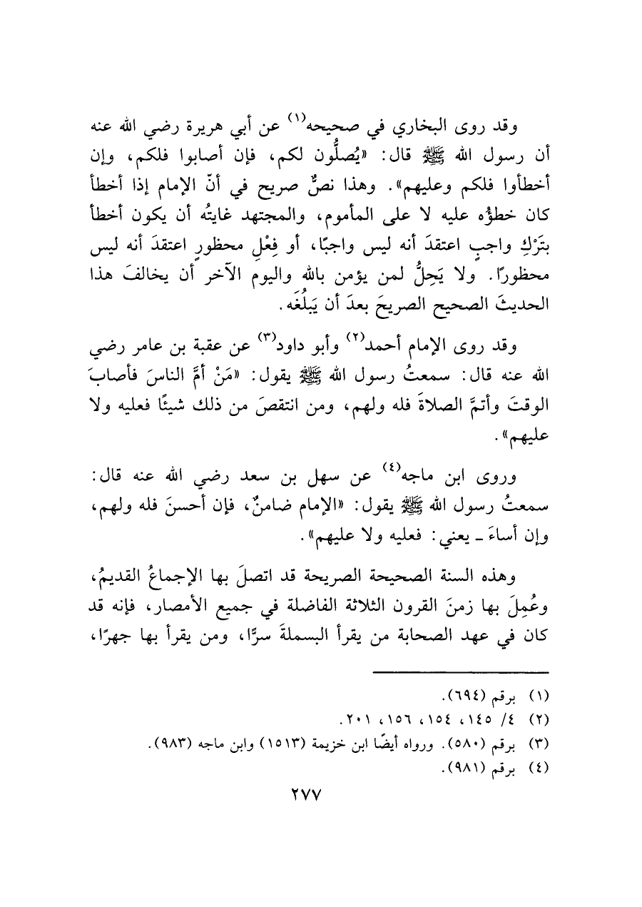 وقد روى البخاري في صحيحه (¬١) عن أبي هريرة رضي الله عنه أن رسول الله - صَلَّى اللَّهُ عَلَيْهِ وَسَلَّمَ - قال: "يُصلُّون لكم، فإن أصابوا فلكم، وإن أخطأوا فلكم وعليهم". وهذا نص صريح في أنّ الإمام إذا أخطأ كان خطؤُه عليه لا على المأموم، والمجتهد غايتُه أن يكون أخطأ بتَرْكِ واجب اعتقدَ أنه ليس واجبًا، أو فِعْلِ محظورٍ اعتقدَ أنه ليس محظورًا. ولا يَحِلُّ لمن يؤمن بالله واليوم الآخر أن يخالفَ هذا الحديثَ الصحيح الصريحَ بعدَ أن يَبلُغَه.