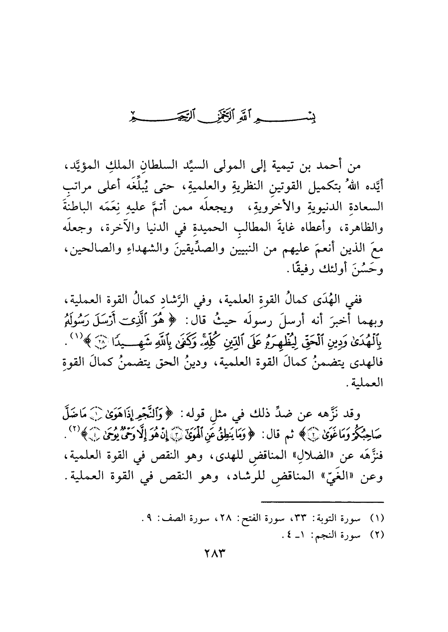 من أحمد بن تيمية إلى المولى السيِّد السلطانِ الملكِ المؤيَّد، أيده الله بتكميل القوتينِ النظريةِ والعلميةِ، حتى يُبلِّغَه أعلى مراتب السعادةِ الدنيويةِ والأخرويةِ، ويجعلَه ممن أتمَّ عليهِ نِعَمَه الباطنَةَ والظاهرة، وأعطاه غايةَ المطالب الحميدةِ في الدنيا والآخرة، وجعلَه معَ الذين أنعمَ عليهم من النبيين والصدِّيقينَ والشهداءِ والصالحين، وحَسُنَ أولئك رفيقًا.
