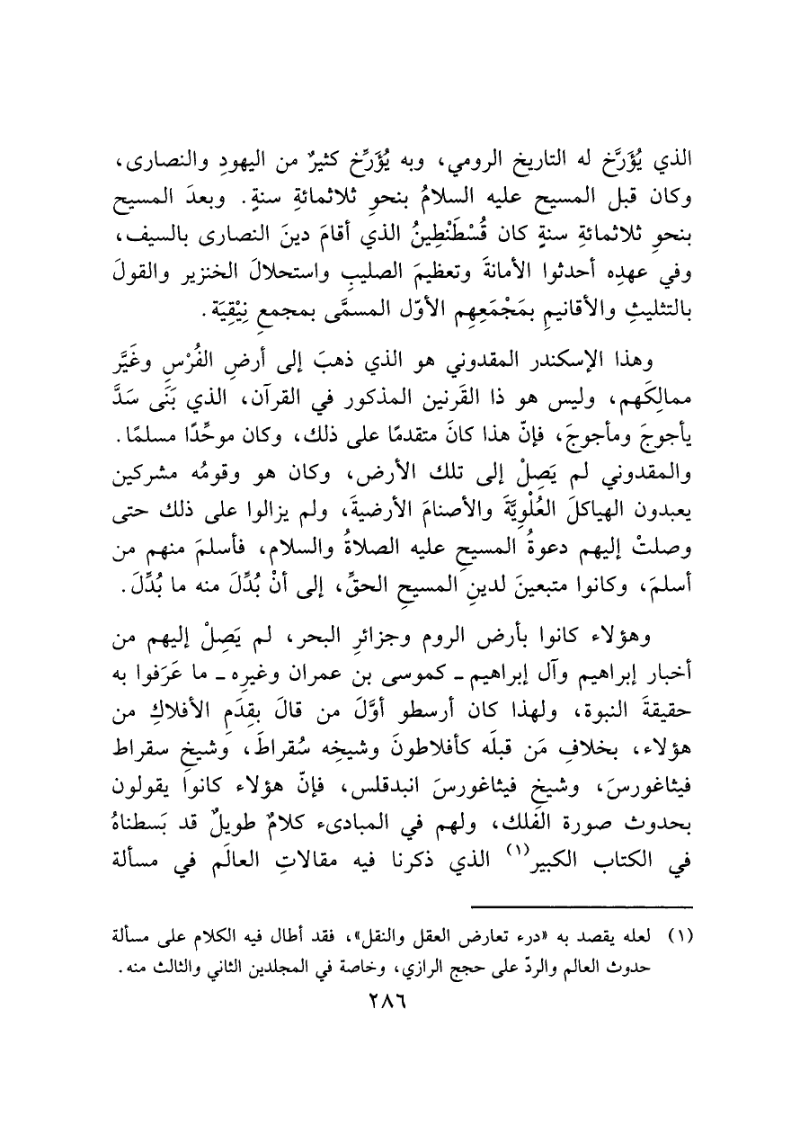 (¬١) لعله يقصد به "درء تعارض العقل والنقل"، فقد أطال فيه الكلام على مسألة حدوث العالم والردّ على حجج الرازي، وخاصة في المجلدين الثاني والثالث منه.