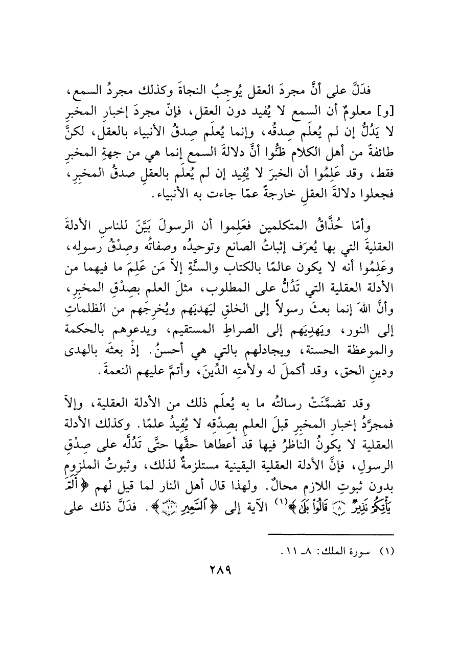فدَل على أنَّ مجردَ العقل يُوجبُ النجاةَ وكذلك مجردُ السمع، [و] معلوم أن السمع لا يُفيد دونَ العقل، فإنّ مجردَ إخبارِ المخبرِ لا يَدُل إن لم يُعلَم صِدقُه، وإنما يُعلَم صِدقُ الأنبياء بالعقل، لكن طائفةً من أهل الكلام ظنُّوا أنَّ دلالةَ السمع إنما هي من جهةِ المخبرِ فقط، وقد عَلِمُوا أن الخبرَ لا يُفِيد إن لم يُعلَم بالعقلِ صدقُ المخبِرِ، فجعلوا دلالةَ العقلِ خارجةً عما جاءت به الأنبياء.