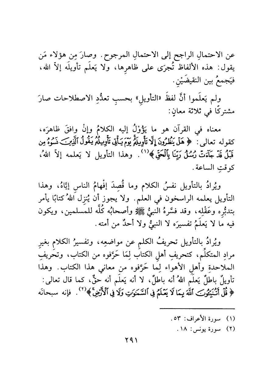 عن الاحتمالِ الراجح إلى الاحتمالِ المرجوح. وصارَ مِن هؤلاء مَن يقول: هذه الألفاظ تُجرَى على ظاهرِها، ولا يَعلَم تأويلَه إلاّ الله، فيَجمعُ بين النقيضَيْنِ.