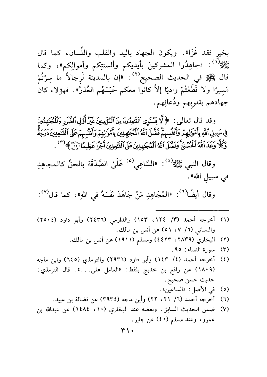 وقد قال تعالى: (لَا يَسْتَوِي الْقَاعِدُونَ مِنَ الْمُؤْمِنِينَ غَيْرُ أُولِي الضَّرَرِ وَالْمُجَاهِدُونَ فِي سَبِيلِ اللَّهِ بِأَمْوَالِهِمْ وَأَنْفُسِهِمْ فَضَّلَ اللَّهُ الْمُجَاهِدِينَ بِأَمْوَالِهِمْ وَأَنْفُسِهِمْ عَلَى الْقَاعِدِينَ دَرَجَةً وَكُلًّا وَعَدَ اللَّهُ الْحُسْنَى وَفَضَّلَ اللَّهُ الْمُجَاهِدِينَ عَلَى الْقَاعِدِينَ أَجْرًا عَظِيمًا (٩٥)) (¬٣).