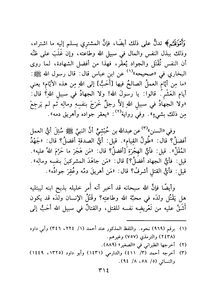وأيضًا فإنَّ الله سبحانه قد أخبر أنه أَمر خليله بذبح ابنه ليبتليه هل يَقْتُل ولدَه في محبَّة الله وطاعتِه؟ وقَتْلُ الإنسان ولدَه قد يكون أَشَقَّ عليه من تَعْريضِه نفسه للقتل، والقتالُ في سبيل الله أحَبُّ إلى
