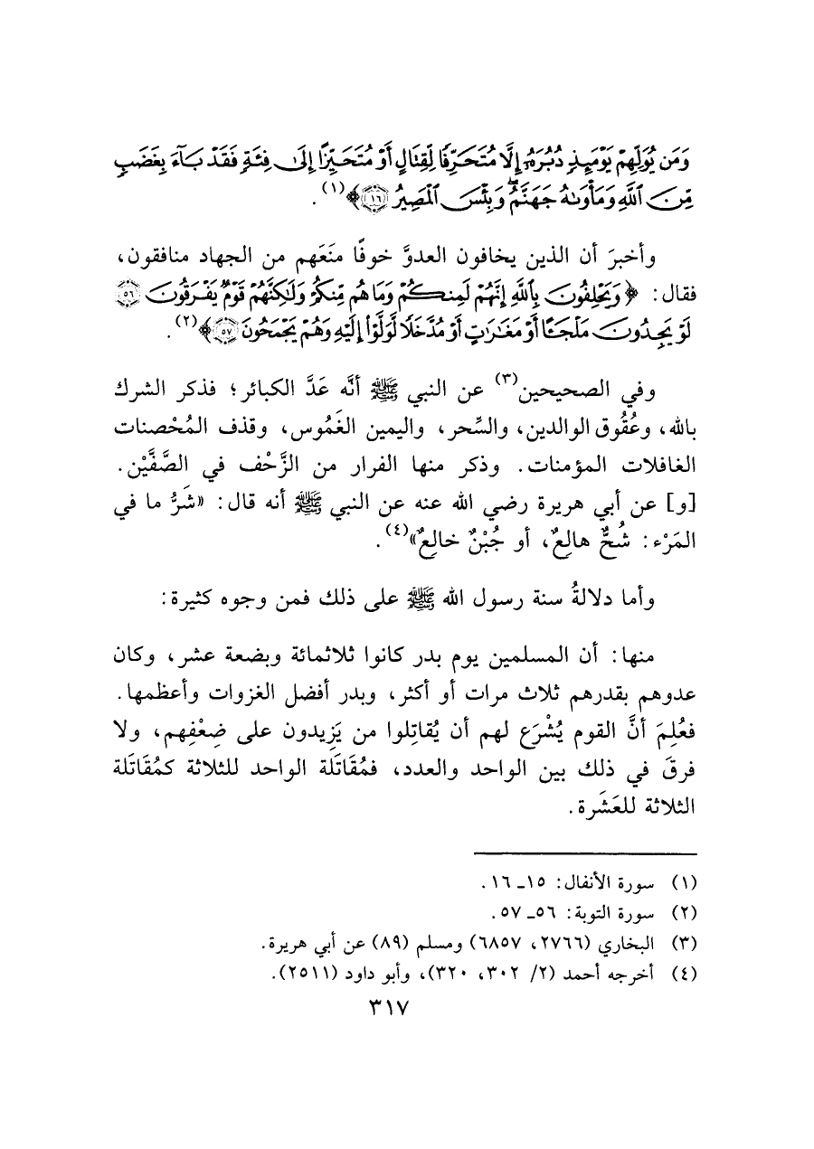 وَمَنْ يُوَلِّهِمْ يَوْمَئِذٍ دُبُرَهُ إِلَّا مُتَحَرِّفًا لِقِتَالٍ أَوْ مُتَحَيِّزًا إِلَى فِئَةٍ فَقَدْ بَاءَ بِغَضَبٍ مِنَ اللَّهِ وَمَأْوَاهُ جَهَنَّمُ وَبِئْسَ الْمَصِيرُ (١٦)) (¬١).
