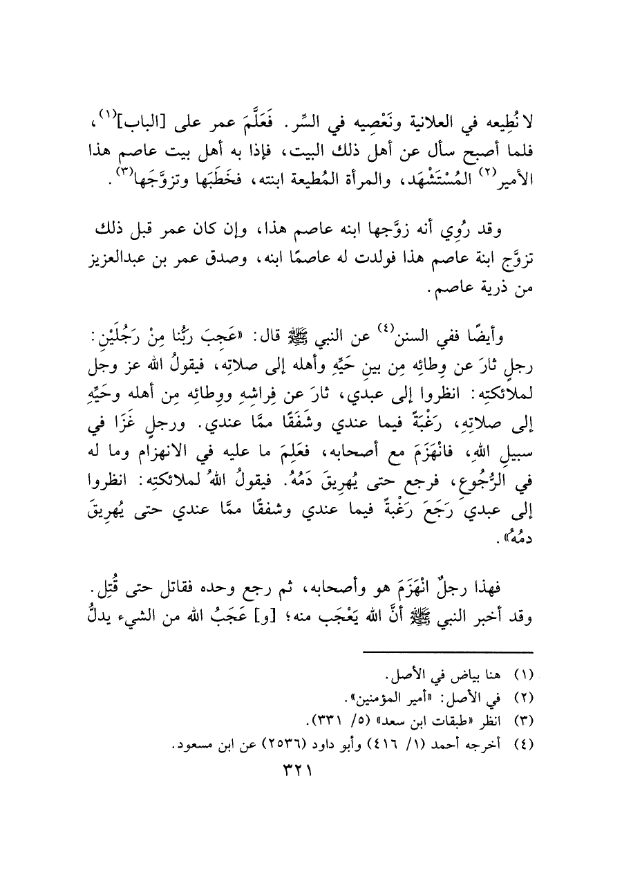 لا نُطِيعه في العلانية ونَعْصِيه في السِّر. فَعَلَّمَ عمر على [الباب] (¬١)، فلما أصبح سأل عن أهل ذلك البيت، فإذا به أهل بيت عاصم هذا الأمير (¬٢) المُسْتَشْهَد، والمرأة المُطيعة ابنته، فخَطَبَها وتزوَّجَها (¬٣).