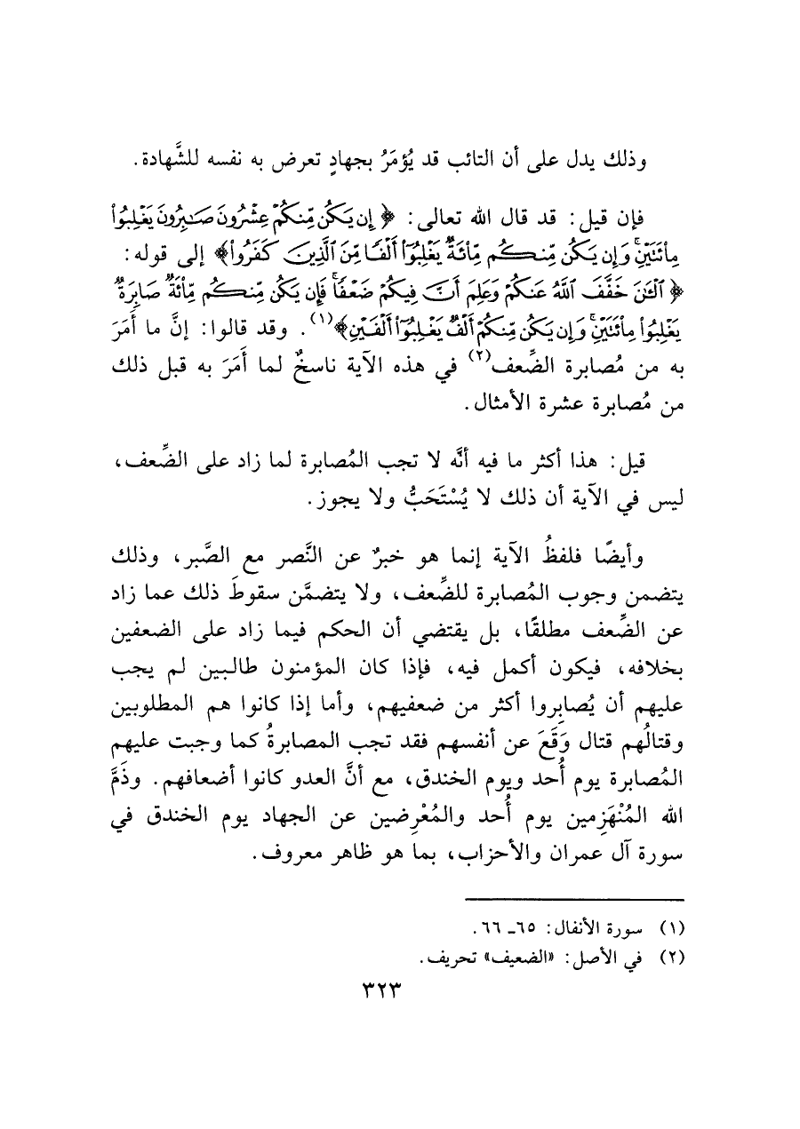 وأيضًا فلفظُ الآية إنما هو خبرٌ عن النَّصر مع الصَّبر، وذلك يتضمن وجوب المُصابرة للضَعف، ولا يتضمَّن سقوطَ ذلك عما زاد عن الضِّعف مطلقا، بل يقتضي أن الحكم فيما زاد على الضعفين بخلافه، فيكون أكمل فيه، فإذا كان المؤمنون ظالمين لم يجب عليهم أن يُصابِروا أكثر من ضعفيهم، وأما إذا كانوا هم المظلومين وقتالُهم قتال وَقَعَ عن أنفسهم فقد تجب المصابرةُ كما وجبت عليهم المُصابرة يوم أُحد ويوم الخندق، مع أنَّ العدو كانوا أضعافهم. وذَمَّ الله المُنْهَزِمين يوم أُحد والمُعْرِضين عن الجهاد يوم الخندق في سورة آل عمران والأحزاب، بما هو ظاهر معروف.