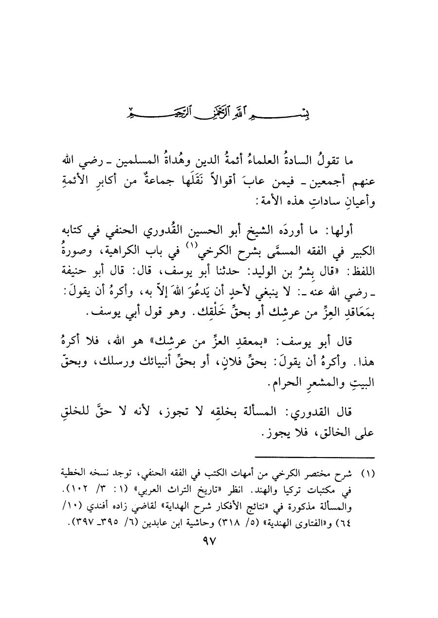 أولها: ما أوردَه الشيخ أبو الحسين القُدوري الحنفي في كتابه الكبير في الفقه المسمَّى بشرح الكرخي (¬١) في باب الكراهية، وصورةُ اللفظ: "قال بِشرُ بن الوليد: حدثنا أبو يوسف، قال: قال أبو حنيفة -رضي الله عنه-: لا ينبغي لأحدٍ أن يَدعُوَ الله إلاّ به، وأكرهُ أن يقولَ: بمَعَاقدِ العِز من عرشِك أو بحقِّ خَلْقِك. وهو قول أبي يوسف.