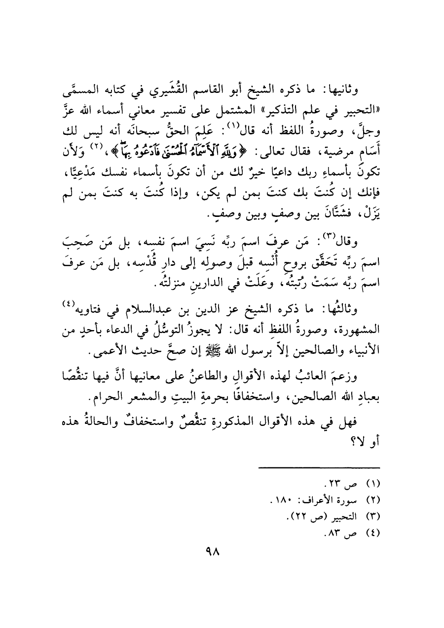 وثانيها: ما ذكره الشيخ أبو القاسم القُشَيري في كتابه المسمَّى "التحبير في علم التذكير" المشتمل على تفسير معاني أسماء الله عزَّ وجلَّ، وصورةُ اللفظ أنه قال (¬١): عَلِمَ الحقُّ سبحانَه أنه ليس لك أَسَام مرضية، فقال تعالى: (وَلِلَّهِ الْأَسْمَاءُ الْحُسْنَى فَادْعُوهُ بِهَا)، (¬٢) وَلأن تكون بأسماءِ ربك داعيًا خيرٌ لك من أن تكونَ بأسماء نفسك مَدْعِيًّا، فإنك إن كُنتَ بك كنتَ بمن لم يكن، وإذا كُنتَ به كنتَ بمن لم يَزَلْ، فشَتَّانَ بين وصفٍ وبين وصفٍ.