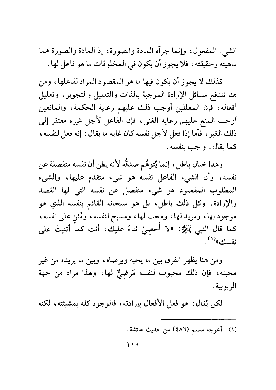 وهذا خيال باطل، إنما يُتوهَّم صدقُه لأنه يظن أن نفسه منفصلة عن نفسه، وأن الشيء الفاعل نفسه هو شيء متقدم عليها، والشيء المطلوب المقصود هو شيء منفصل عن نفسه التي لها القصد والإرادة. وكل ذلك باطل، بل هو سبحانه القائم بنفسه الذي هو موجود بها، ومريد لها، ومحب لها، ومسبح لنفسه، ومُثني على نفسه، كما قال النبي - صَلَّى اللَّهُ عَلَيْهِ وَسَلَّمَ -: "لا أُحصِيْ ثناء عليك، أنت كما أثنيتَ على نفسك" (¬١).