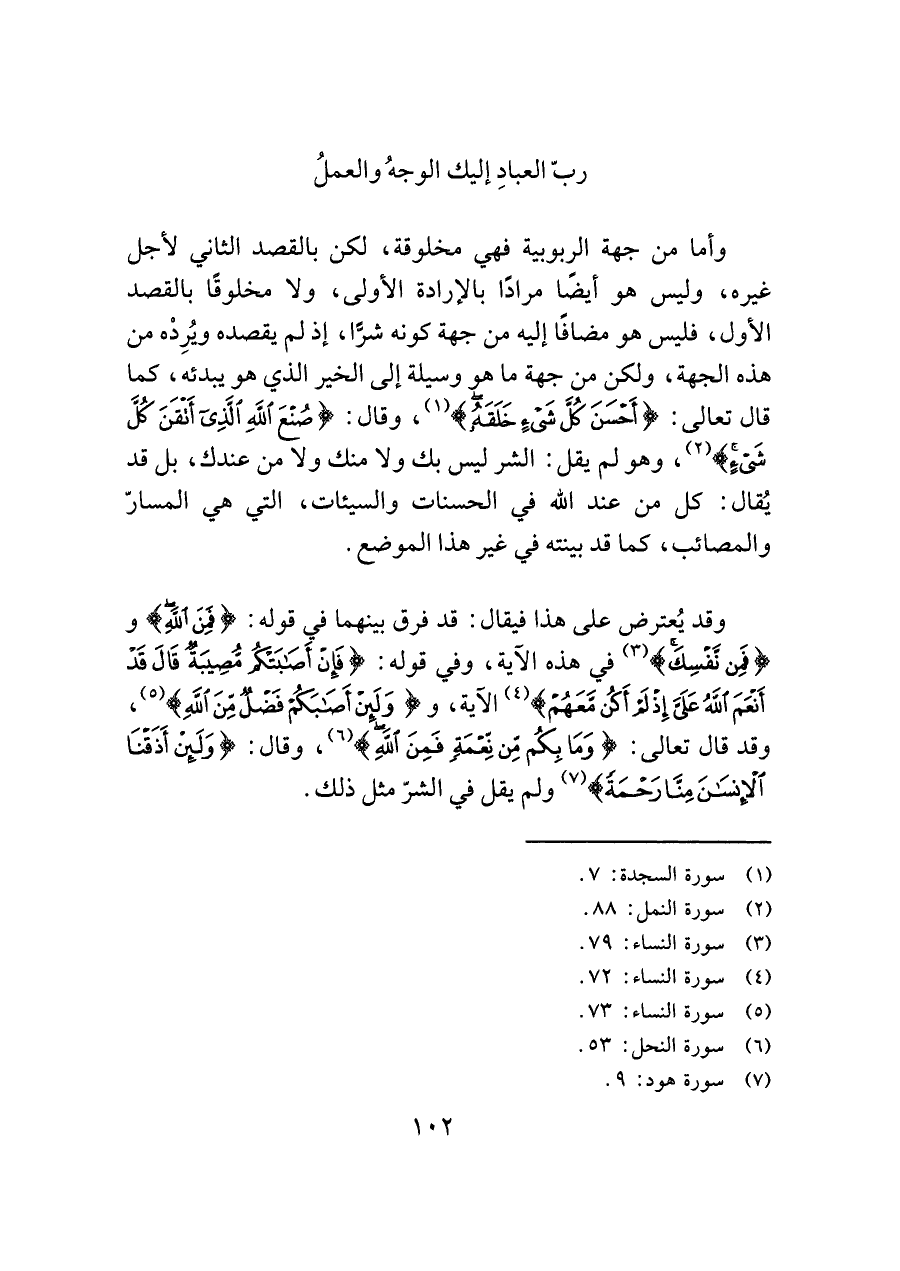 وأما من جهة الربوبية فهي مخلوقة، لكن بالقصد الثاني لأجل غيره، وليس هو أيضَا مرادًا بالإرادة الأولى، ولا مخلوقًا بالقصد الأول، فليس هو مضافَا إليه من جهة كونه شرَّا، إذ لم يقصده ويُرِدْه من هذه الجهة، ولكنِ من جهة ما هو وسيلة إلى الخير الذي هو يبدئه، كما قال تعالى: (أَحْسَنَ كُلَّ شَيْءٍ خَلَقَهُ) (¬١)، وقال: (صُنْعَ اللَّهِ الَّذِي أَتْقَنَ كُلَّ شَيْءٍ) (¬٢)، وهو لم يقل: الشر ليس بك ولا منك ولا من عندك، بل قد يُقال: كل من عند الله في الحسنات والسيئات، التي هي المسارّ والمصائب، كما قد بينته في غير هذا الموضع.